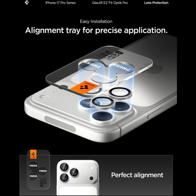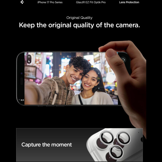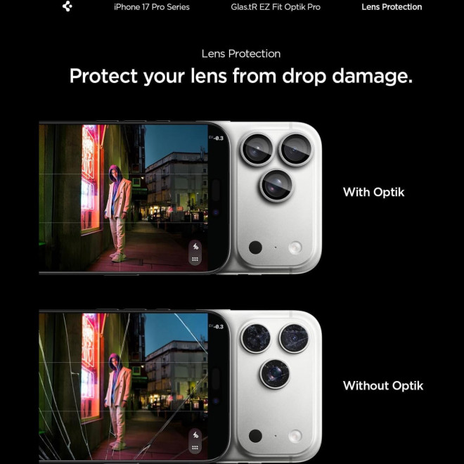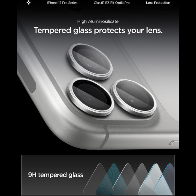 Το αντιχαρακτικό γυάλινο Tempered Glass GLAS.tR EZ Fit OPTIK Pro της Spigen, είναι ειδικά σχεδιασμένο για τον φακό της κάμερας του iPhone 17 Pro / 17 Pro Max / 16 Pro / 16 Pro Max / 15 Pro / 15 Pro Max / 14 Pro / 14 Pro Max και είναι κατασκευασμένο από γυαλί που διαθέτει υψηλό συντελεστή προστασίας, με σκληρότητα 9Η, προκειμένου να αποφεύγεται η θραύση του γυαλιού ή το σπάσιμό του.