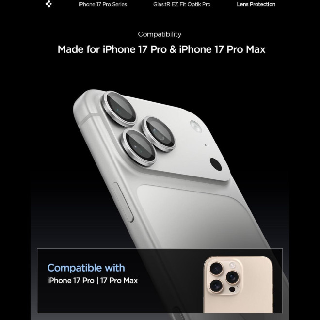 Το Camera Lens Protector είναι συμβατό μόνο με το iPhone 17 Pro / 17 Pro Max / 16 Pro / 16 Pro Max / 15 Pro / 15 Pro Max / 14 Pro / 14 Pro Max και όχι με το iPhone 17, 17 Air, 16, 16 Plus, 16e, 15, 15 Plus, 14 ή 14 Plus.