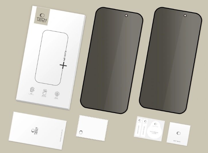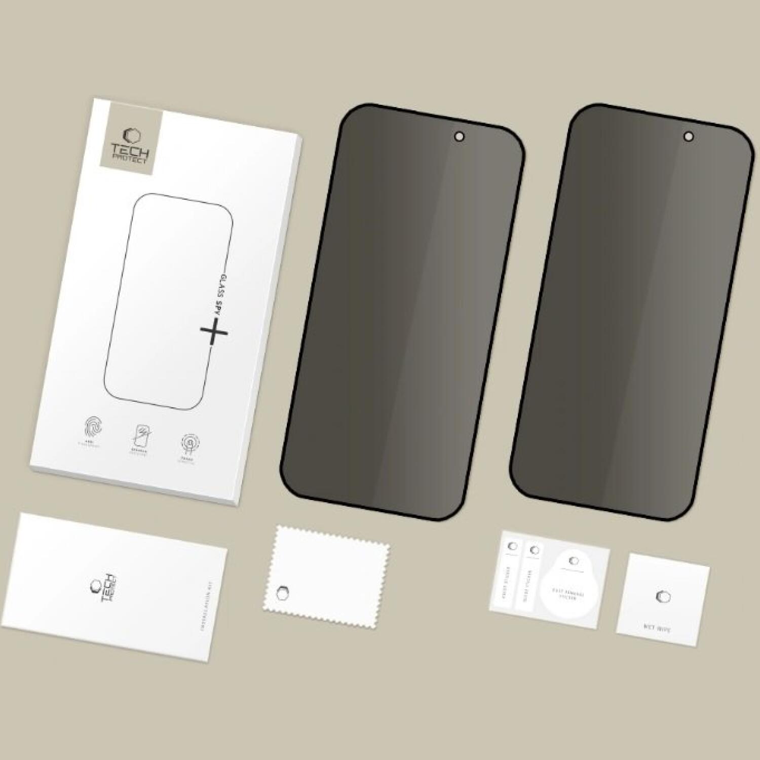Η συσκευασία περιλαμβάνει: 2 x Tempered Glass Tech-Protect Glass Spy+ Privacy, 2 x Κιτ Εγκατάστασης.