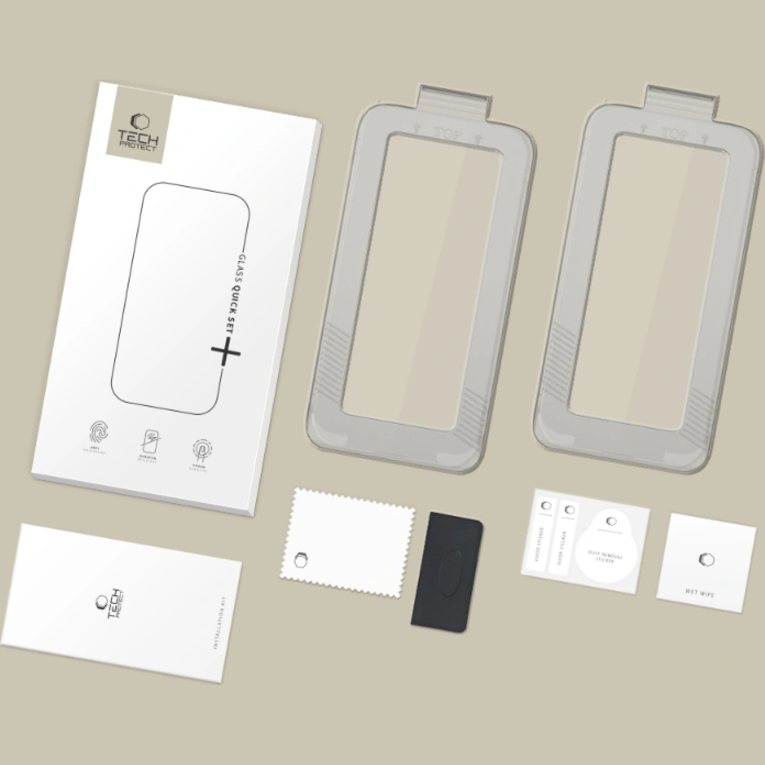 Η συσκευασία περιλαμβάνει: 2 x Tempered Glass Tech-Protect Quick Set+ με πλαίσιο τοποθέτησης, 2 x Κιτ Εγκατάστασης, 1 x Σπάτουλα.