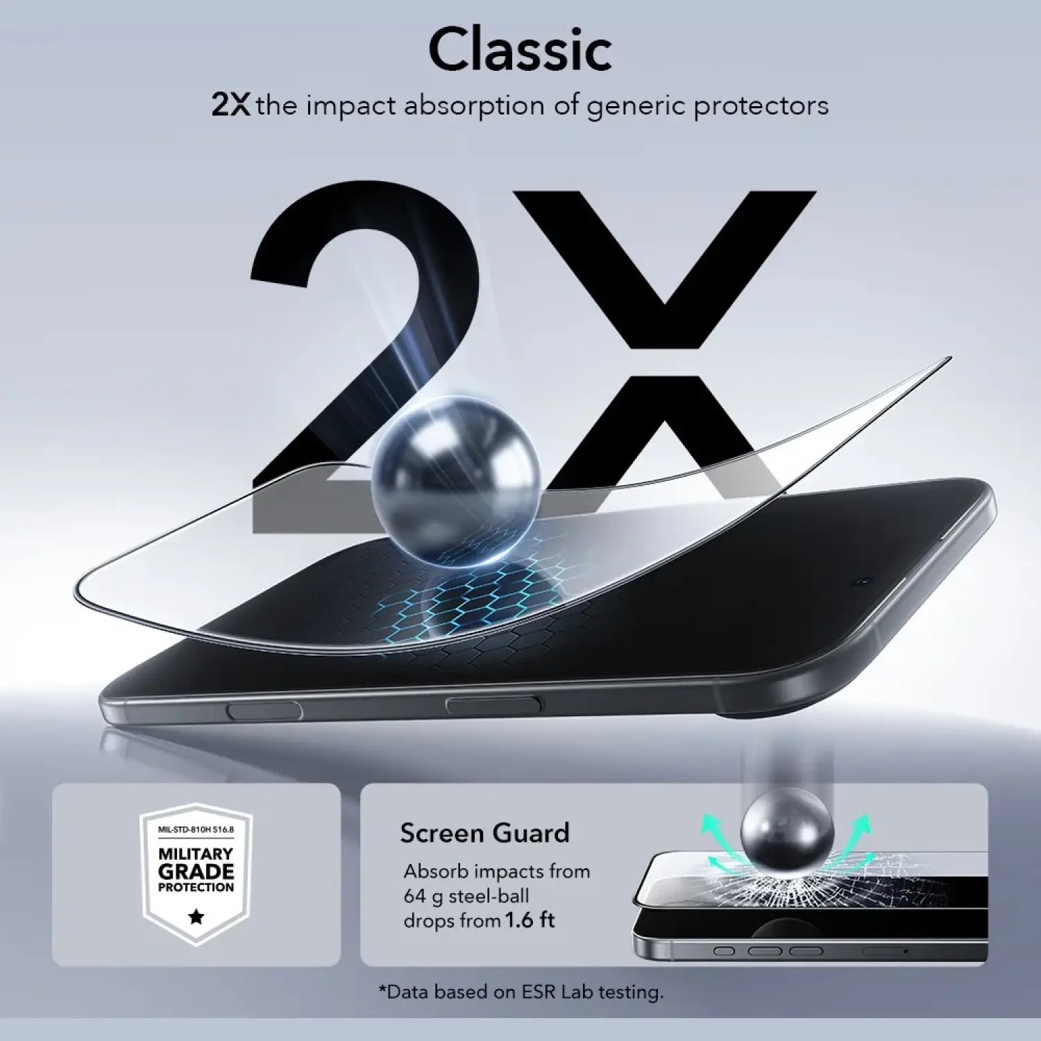 Επίσης είναι το πρώτο γυαλί προστασίας το οποίο είναι πιστοποιημένο σύμφωνα με τα στρατιωτικά πρότυπα και έχει λάβει πιστοποίηση MIL-STD-810H 516.8, αυτό σημαίνει ότι είναι 2 φορές πιο ανθεκτικό από τα κοινά tempered glass της αγοράς, καθώς είναι σχεδιασμένο για να αντέχει σε κρούσεις έως και 13,5 κιλά, προσφέροντας κορυφαία προστασία για την οθόνη σας.