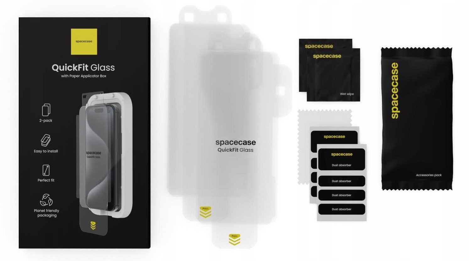 Η συσκευασία περιλαμβάνει: 2 x QuickFit Glass, 2 x Πανάκια Υγρά, 2 x Σετ Αυτοκόλλητα για τη σκόνη, 1 x Πανάκι Μικροϊνών, 1 x Απλικατέρ/Συσκευασία. Συνιστάται να δείτε το βίντεο για την ορθή τοποθέτηση του QuickFit Glass.