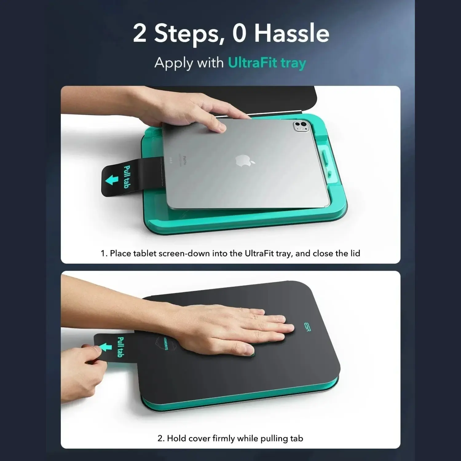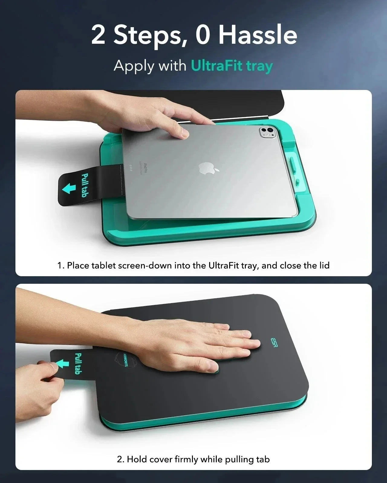 Η συσκευασία περιλαμβάνει: 2 x Tempered glass ESR UltraFit Armorite, 2 x Kit τοποθέτησης, 1 x Δίσκος εγκατάστασης.