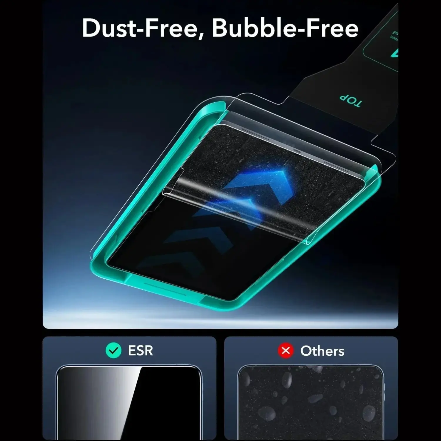Σας εξασφαλίζει μία ομοιόμορφη και αποτελεσματική εφαρμογή, με ευθυγράμμιση σε τέσσερις γωνίες για σταθερό και ασφαλές αποτέλεσμα, μειώνοντας την ακούσια κίνηση. Η λωρίδα απομάκρυνσης φυσαλίδων αέρα εξασφαλίζει τη γρήγορη απομάκρυνση του αέρα και μειώνει τις ατέλειες κατά την εφαρμογή. Η ταινία τραβήγματος, αφαιρεί τη σκόνη για εύκολη εφαρμογή, ενώ ο δίσκος εξασφαλίζει την ακριβή ευθυγράμμιση.