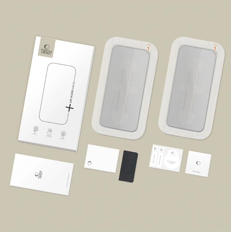 Η συσκευασία περιλαμβάνει: 2 x Tempered Glass Tech-Protect Quick Set Spy+ Privacy με πλαίσιο τοποθέτησης, 2 x Κιτ Εγκατάστασης, 1 x Σπάτουλα.