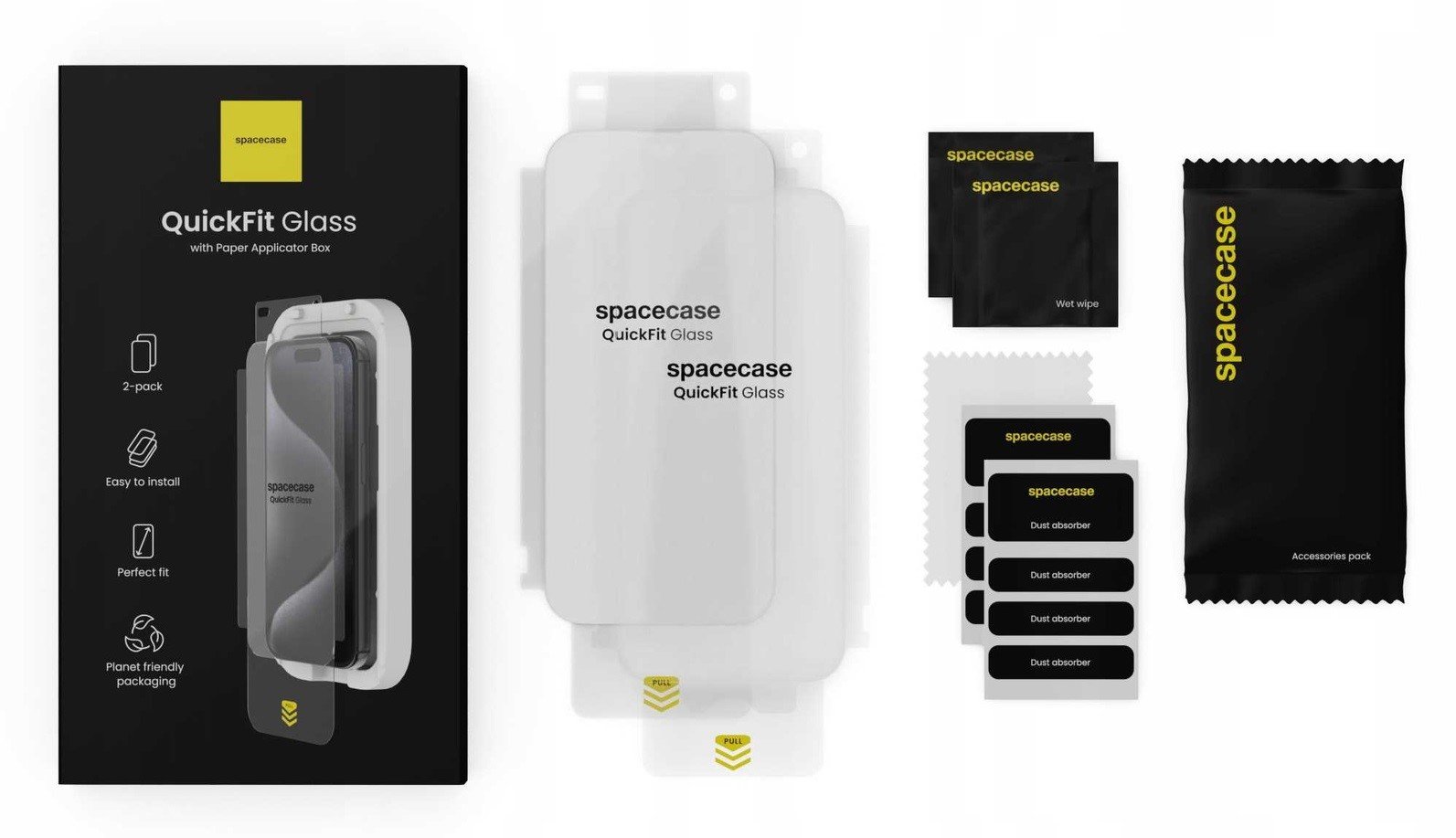 Η συσκευασία περιλαμβάνει: 2 x QuickFit Glass, 2 x Πανάκια Υγρά, 2 x Σετ Αυτοκόλλητα για τη σκόνη, 1 x Πανάκι Μικροϊνών, 1 x Απλικατέρ/Συσκευασία. Συνιστάται να δείτε το βίντεο για την ορθή τοποθέτηση του QuickFit Glass.