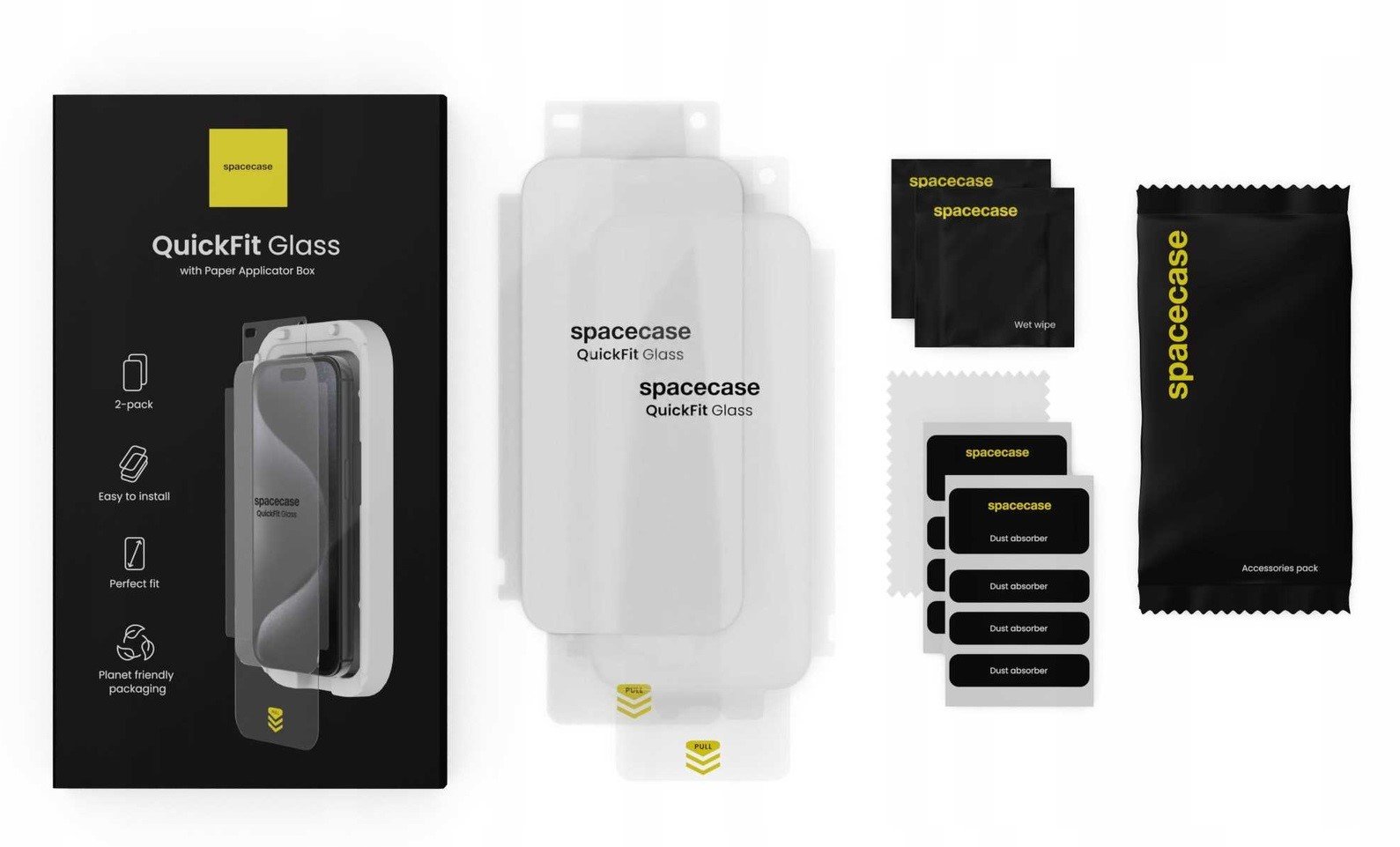 Η συσκευασία περιλαμβάνει: 2 x QuickFit Glass, 2 x Πανάκια Υγρά, 2 x Σετ Αυτοκόλλητα για τη σκόνη, 1 x Πανάκι Μικροϊνών, 1 x Απλικατέρ/Συσκευασία. Συνιστάται να δείτε το βίντεο για την ορθή τοποθέτηση του QuickFit Glass.