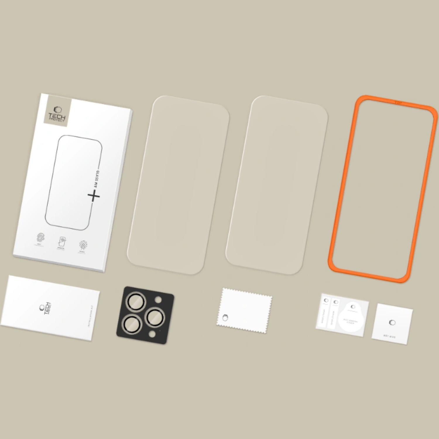 Η συσκευασία περιλαμβάνει: 2 x Tempered Glass οθόνης Tech-Protect Easy Set+, 1 x Tempered Glass για Φακό Κάμερας, 2 x Κιτ εγκατάστασης, 1 x Πλαίσιο τοποθέτησης.