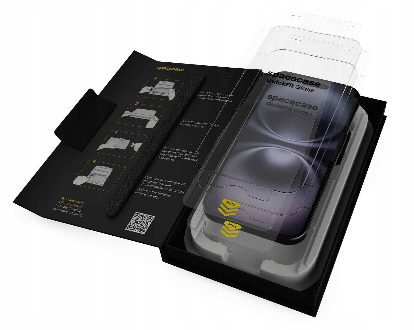 Η συσκευασία περιλαμβάνει: 2 x QuickFit Glass, 2 x Πανάκια Υγρά, 2 x Σετ Αυτοκόλλητα για τη σκόνη, 1 x Πανάκι Μικροϊνών, 1 x Απλικατέρ/Συσκευασία. Συνιστάται να δείτε το βίντεο για την ορθή τοποθέτηση του QuickFit Glass.