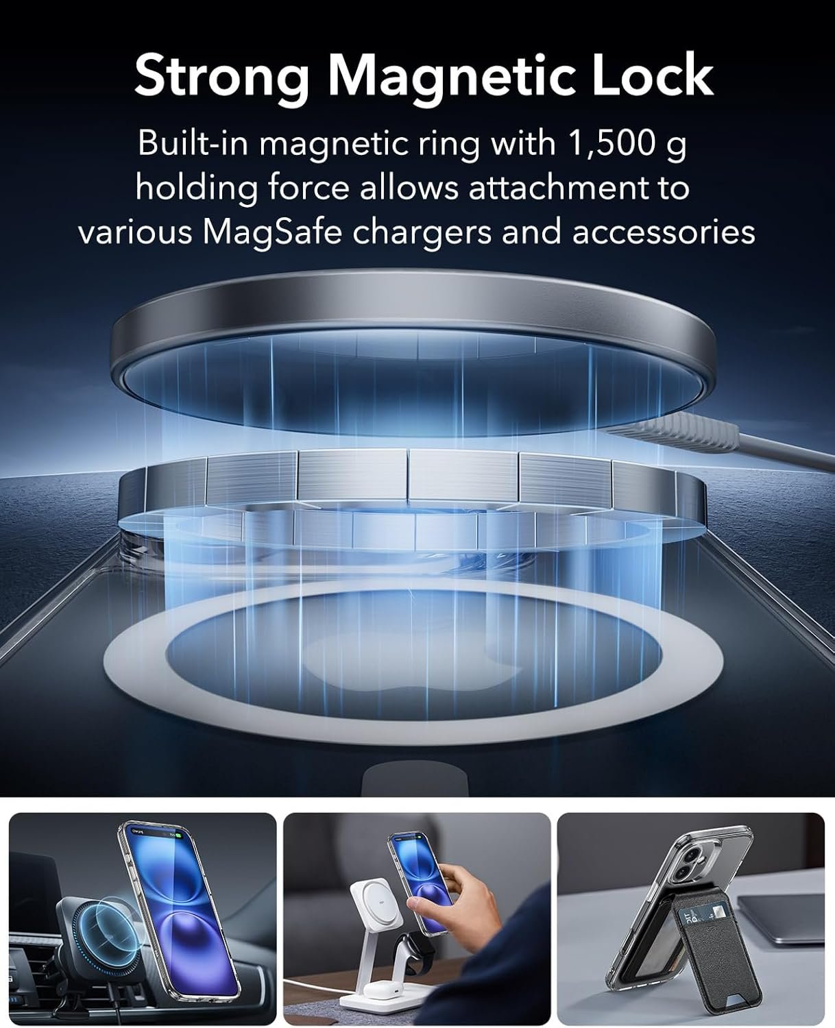 Επιπλέον, διαθέτει ισχυρό ενσωματωμένο μαγνήτη για τον φορτιστή και τα αξεσουάρ MagSafe και παρέχει 1.500g δύναμη συγκράτησης, για μία ασφαλή εμπειρία χρήσης. Στο σετ περιλαμβάνεται και ένα αντιχαρακτικό tempered glass με πλαίσιο τοποθέτησης, το οποίο είναι κατασκευασμένο από ενισχυμένο πραγματικό γυαλί 9H, με πολύ λεπτή σύνθεση και με πάχος μόλις 0.3mm, έτσι ώστε να μην επηρεάζεται η λειτουργία αφής.