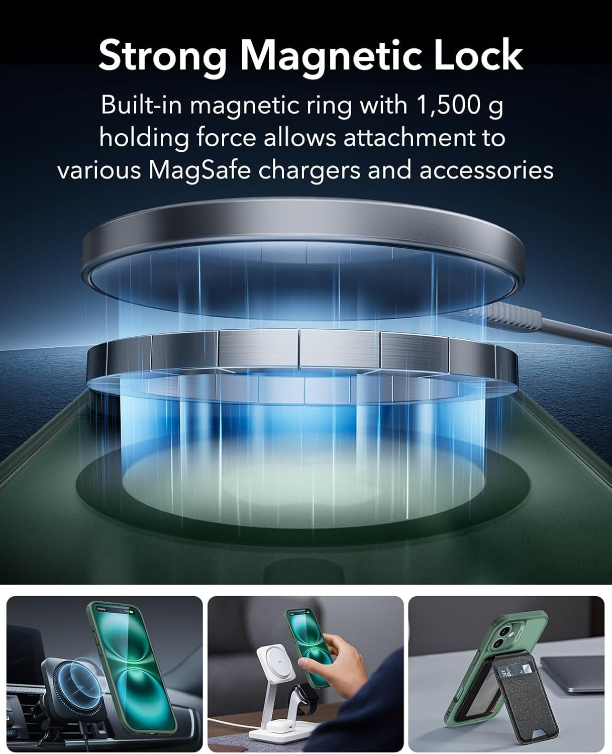 Επιπλέον, διαθέτει ισχυρό ενσωματωμένο μαγνήτη για τον φορτιστή και τα αξεσουάρ MagSafe και παρέχει 1.500g δύναμη συγκράτησης, για μία ασφαλή εμπειρία χρήσης. Στο σετ περιλαμβάνεται και ένα αντιχαρακτικό tempered glass με πλαίσιο τοποθέτησης, το οποίο είναι κατασκευασμένο από ενισχυμένο πραγματικό γυαλί 9H, με πολύ λεπτή σύνθεση και με πάχος μόλις 0.3mm, έτσι ώστε να μην επηρεάζεται η λειτουργία αφής.