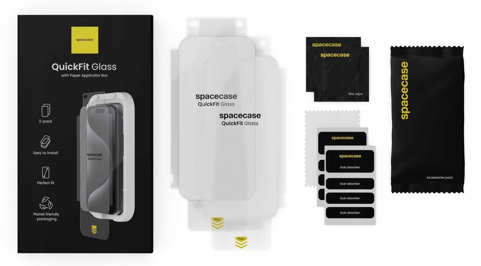 Η συσκευασία περιλαμβάνει: 2 x QuickFit Glass, 2 x Πανάκια Υγρά, 2 x Σετ Αυτοκόλλητα για τη σκόνη, 1 x Πανάκι Μικροϊνών, 1 x Απλικατέρ/Συσκευασία. Συνιστάται να δείτε το βίντεο για την ορθή τοποθέτηση του QuickFit Glass.