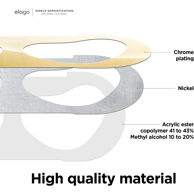 Αποτελείται από υψηλής ποιότητας υλικά, 3 στρώσεων, όπως επιχρωμιωμένο μέταλλο, νικέλιο και ακριλικό εστέρα. Το μεταλλικό φινίρισμα προσθέτει εκπληκτική εμφάνιση στη θήκη φόρτισής σας. Διατηρήστε την θήκη σας καθαρή και να μοιάζει για μεγάλο χρονικό διάστημα σαν καινούργια!