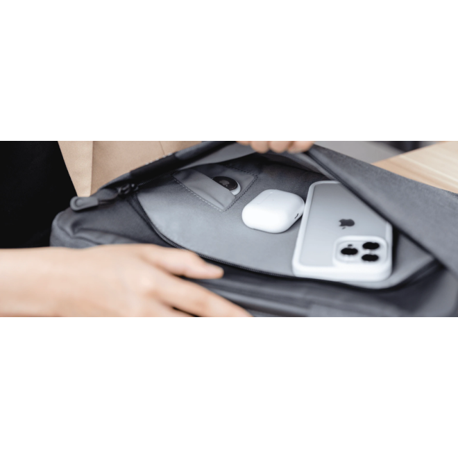 Η μαλακή εσωτερική επένδυση της προστατεύει από γρατσουνιές και πτώσεις, ενώ η εξωτερική τσέπη σας επιτρέπει να αποθηκεύετε αξεσουάρ όπως ακουστικά, Powerbank, Smartphone και πολλά άλλα. Στο εσωτερικό της θήκης υπάρχει μια κρυφή τσέπη AirTag, που σας επιτρέπει να τοποθετήσετε το AirTag σας και να παρακολουθείτε που βρίσκεται η τσάντα σας ανά πάσα στιγμή.