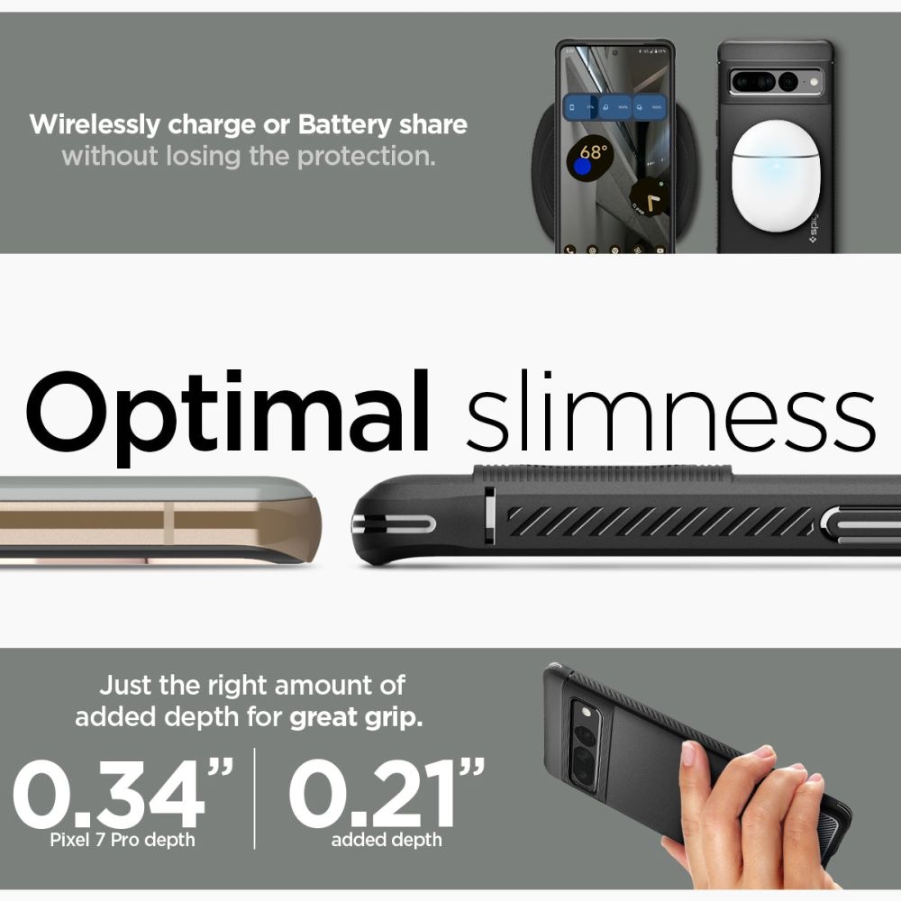 Η θήκη Rugged Armor της Spigen είναι κατασκευασμένη για να εφαρμόζει τέλεια στο Google Pixel 7 Pro και να το προστατεύει από την καθημερινή χρήση, αποτελεσματικά, χωρίς να προσθέτει επιπλέον όγκο στη συσκευή σας.