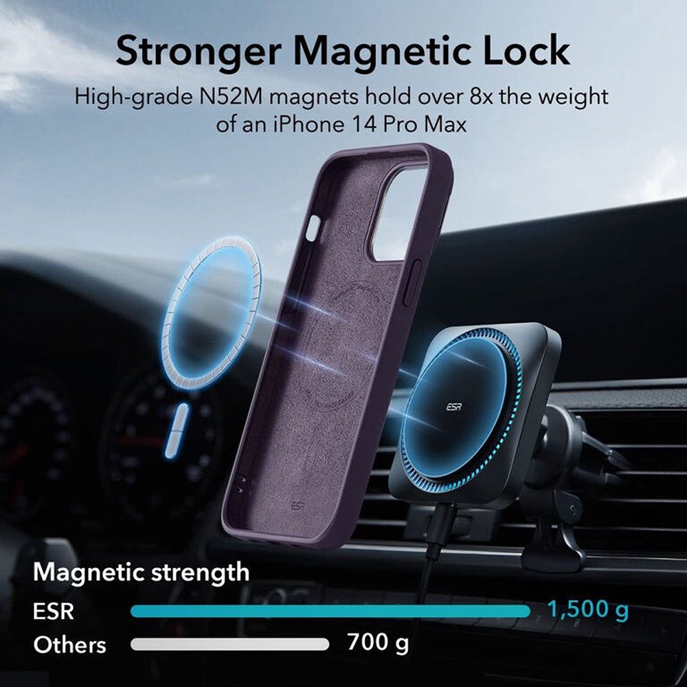 Η καινοτόμος σχεδίασή της κάνει το φορτιστή MagSafe και άλλα αξεσουάρ να προσαρμόζονται στη θήκη ESR και στο τηλέφωνο με τέλειο τρόπο. Η θήκη αυτή πληροί τις στρατιωτικές προδιαγραφές MIL-STD-810H-516.8, έχοντας περάσει μια σειρά απαιτητικών δοκιμασιών σχετικά με την αντοχή της.