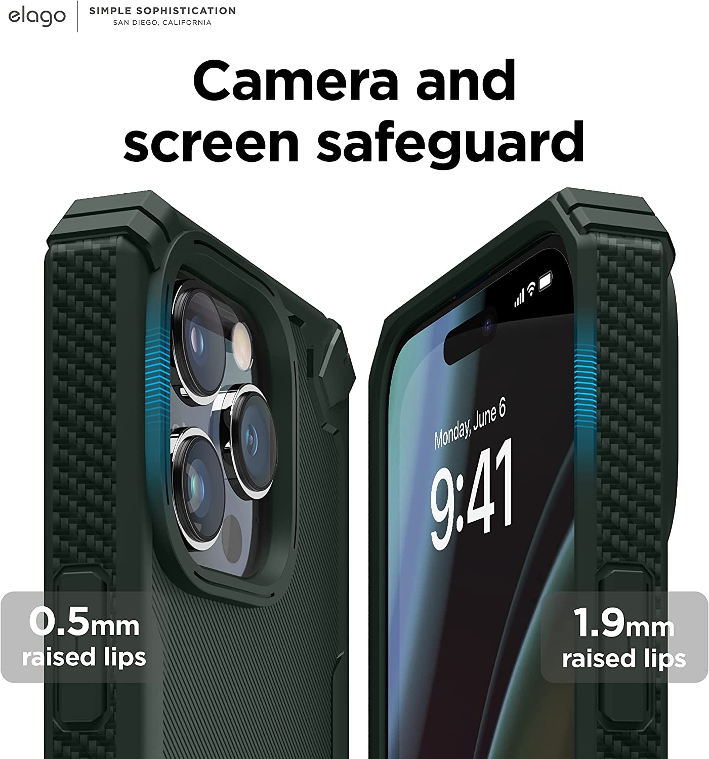 Προσφέρει διπλή απορρόφηση κραδασμών, χάρη στο εξωτερικό αντικραδασμικό σκληρό Bumper και στο εσωτερικό στρώμα απορρόφησης κραδασμών. Είναι σχεδιασμένο με προσοχή στη λεπτομέρεια καθώς διαθέτει Bumber, μοτίβο από ανθρακονήματα και ένα μοναδικό σχεδιασμό από λωρίδες στην πλάτη. Τέλος, διαθέτει όλες τις απαραίτητες εγκοπές ώστε να μην παρεμποδίζεται η χρήση του iPhone 14 Pro Max.