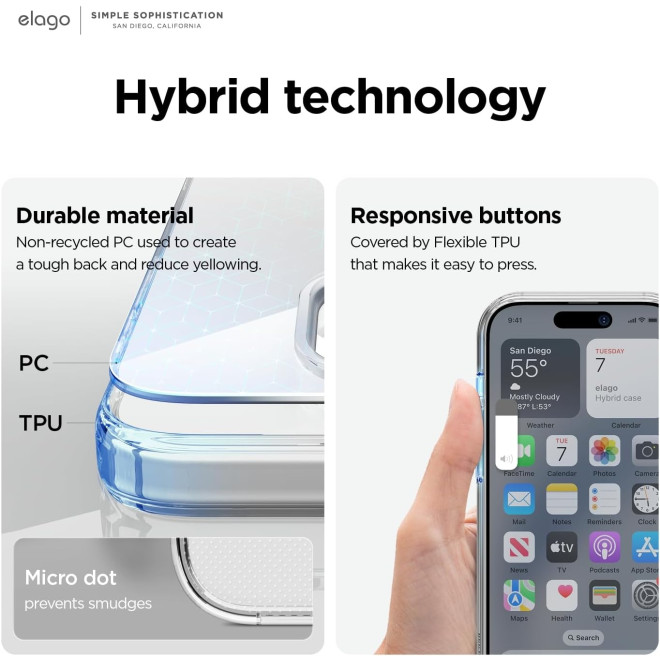 H διάφανη θήκη Hybrid της Elago, είναι ειδικά σχεδιασμένη για να προστατέψει μοναδικά το αγαπημένο σας iPhone 15 Pro. Είναι μία λεπτή, κομψή αλλά απόλυτα ανθεκτική θήκη! Δοκιμασμένη σε ακραίες καταστάσεις, με πιστοποίηση στρατιωτικού βαθμού R17160 MIL-STD-810G και αντοχή στις πτώσεις.