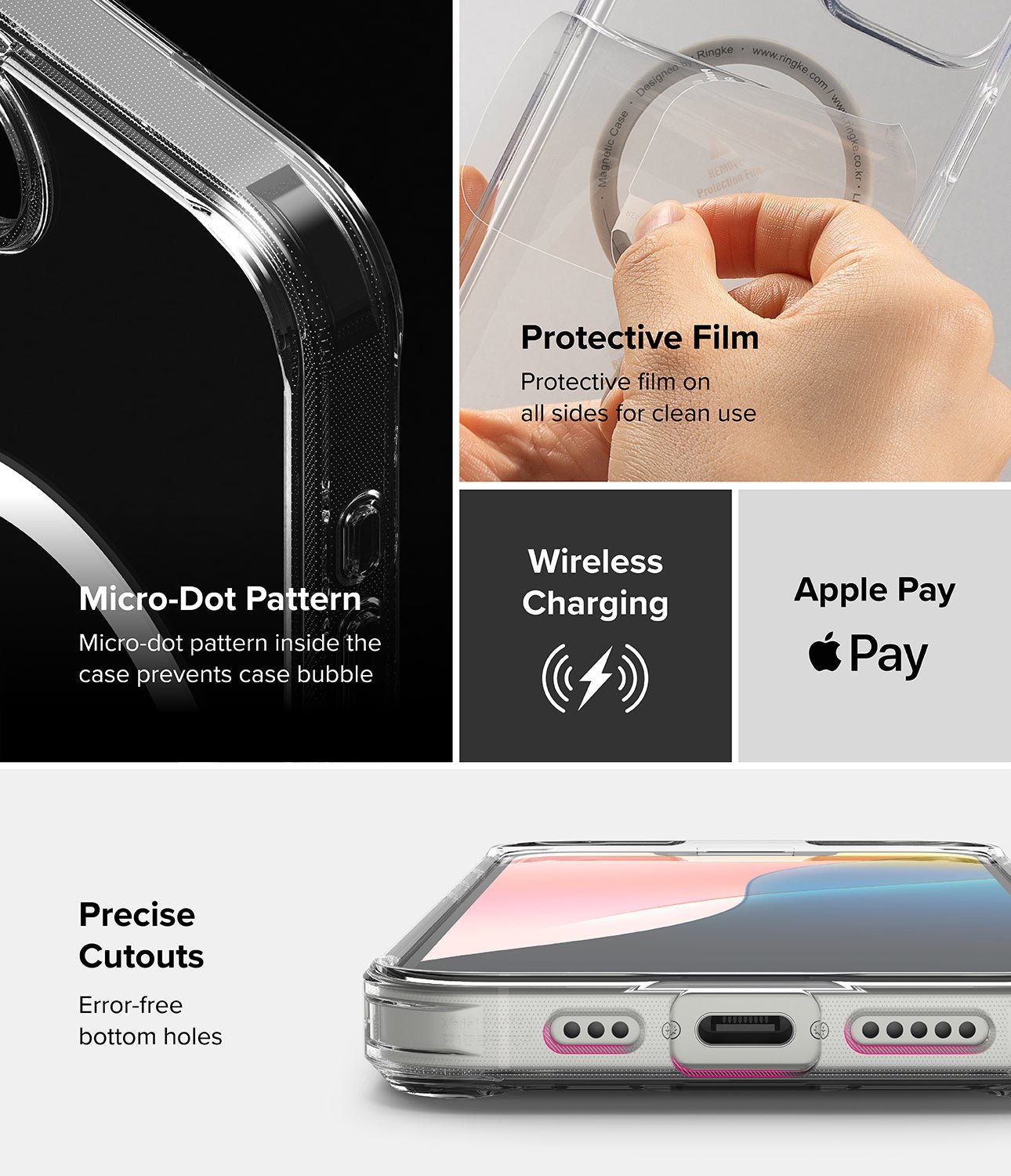 Η θήκη Ringke Fusion Magsafe διαθέτει μαγνητικό δακτύλιο συμβατό με τον ασύρματο φορτιστή MagSafe για γρήγορη και εύκολη φόρτιση. Διαθέτει τεχνολογία 360° με υπερυψωμένο χείλος περιμετρικά ώστε να προστατεύσει την οθόνη σας σε μία ενδεχόμενη πτώση στο έδαφος αλλά ταυτόχρονα ενισχύει και την αισθητική της συσκευής σας.