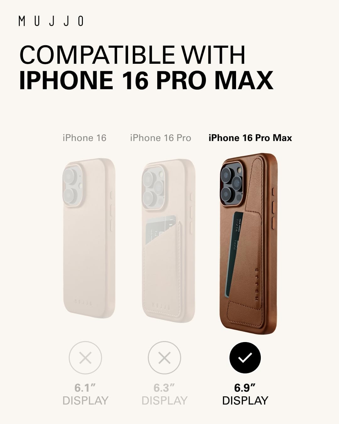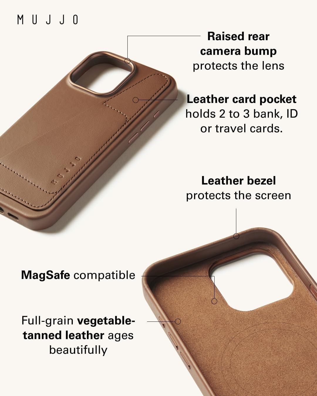 Σημείωση: Λόγω του ότι το δέρμα είναι αληθινό, καμία θήκη της MUJJO δεν είναι εντελώς όμοια με την άλλη - μπορείτε να δείτε παραλλαγές της υφής κόκκων ή διαφορετικές φυσικές γραμμές στο δέρμα. Για την προσάρτηση της θήκης σε αξεσουάρ και φορτιστή MagSafe, οι κάρτες πρέπει να αφαιρεθούν πριν από τη χρήση.