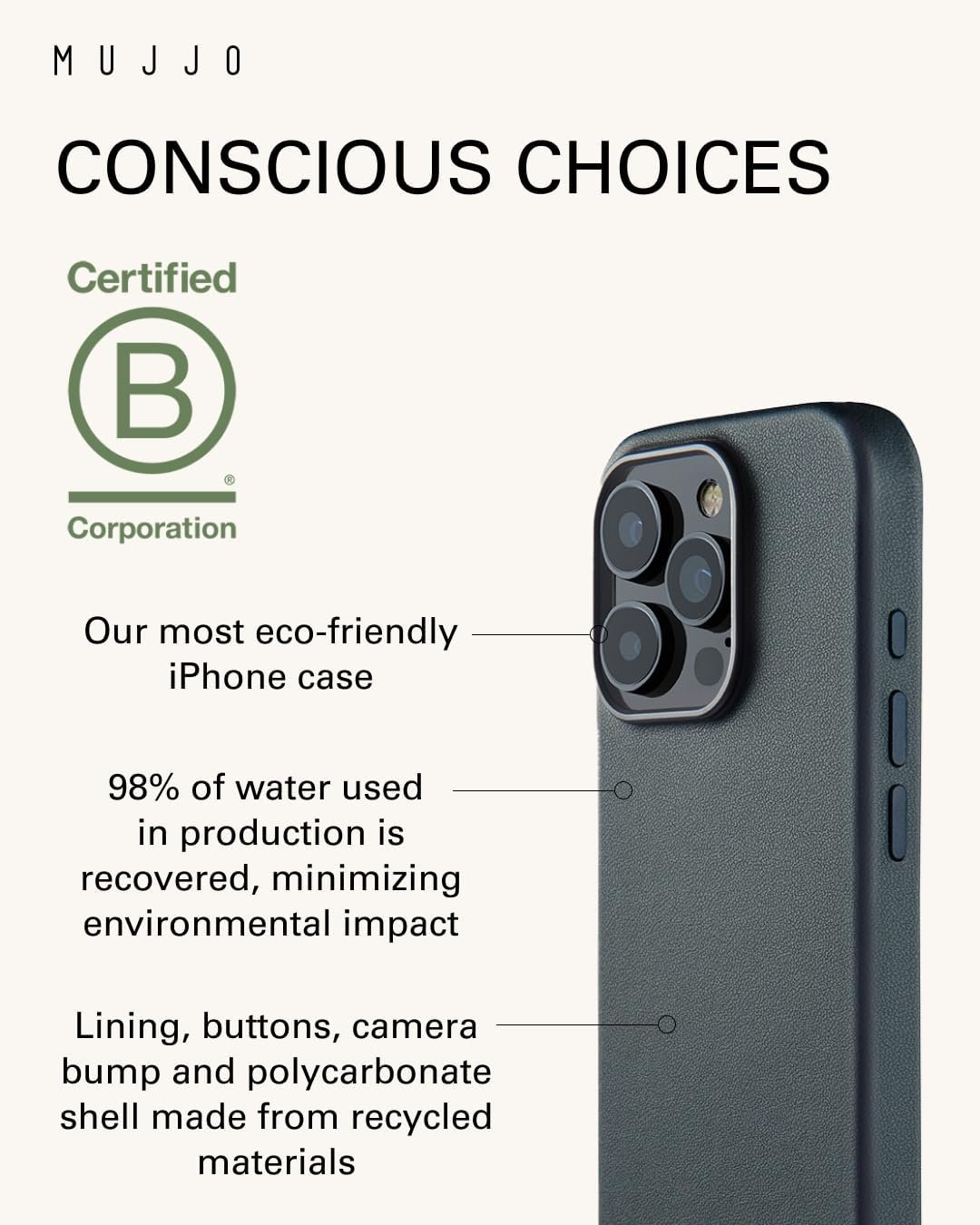 Ενσωματωμένη με ισχυρούς μαγνήτες MagSafe, επιτρέπει τη γρήγορη και ασφαλή ασύρματη φόρτιση, προσφέροντας απρόσκοπτη σύνδεση με όλα τα συμβατά αξεσουάρ MagSafe. Αξιοποιώντας τη φιλική προς το περιβάλλον προσέγγιση της Mujjo, το 98% του νερού που χρησιμοποιείται κατά την παραγωγή ανακτάται, ελαχιστοποιώντας τις περιβαλλοντικές επιπτώσεις. Με απαράμιλλη ποιότητα και κομψό, διαχρονικό design, αυτή η θήκη είναι ο ιδανικός σύντροφος για το iPhone 16 Pro!
