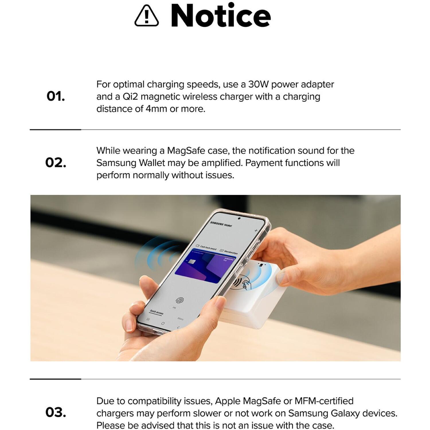 Σημείωση: Τα αξεσουάρ MagSafe δεν περιλαμβάνονται. Όταν χρησιμοποιείτε την MagSafe θήκη, η ειδοποίηση του Samsung Pay μπορεί να ακούγεται λίγο πιο έντονα. Ωστόσο, η λειτουργία Touch to Pay συνεχίζει να δουλεύει κανονικά. Επίσης, οι φορτιστές Apple MagSafe ή όσοι έχουν πιστοποίηση MFM ίσως φορτίζουν πιο αργά ή να μη λειτουργούν σωστά με τις συσκευές Samsung Galaxy.