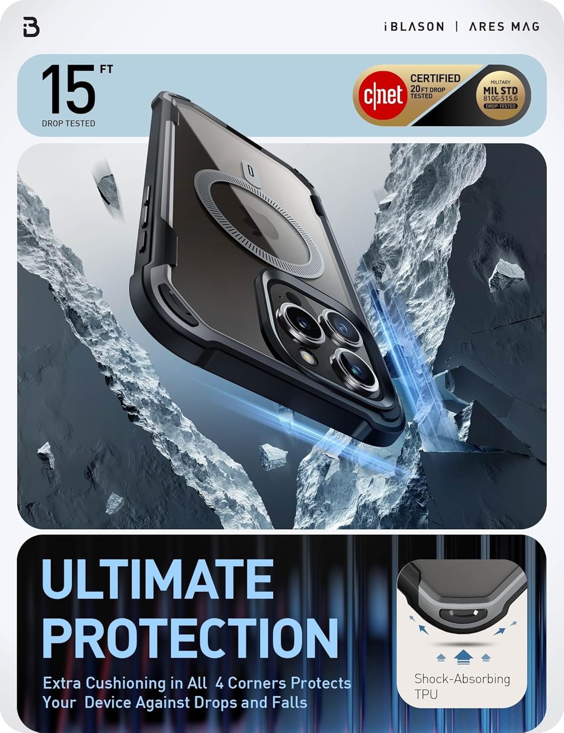 Η πλήρως λειτουργική και ανθεκτική MagSafe θήκη i-Blason Ares της Supcase, θα προστατέψει το αγαπημένο σας iPhone 15 Pro Max από σκόνες, άμμο, χιόνι και σταγόνες νερού. Κάθε προϊόν Supcase πληροί το στρατιωτικό πρότυπο αντίστασης MIL STD 810G 516.6, που σημαίνει ότι έπεσε 26 φορές από ύψος 2 μέτρων.