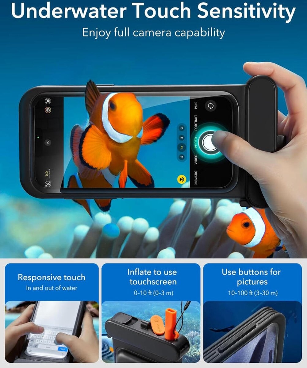 Ο σχεδιασμός της εξασφαλίζει την πλήρη λειτουργικότητα του τηλεφώνου σας, επιτρέποντάς σας να χρησιμοποιείτε την οθόνη αφής και τα κουμπιά ακόμα και υποβρύχια. Μπορείτε να τραβάτε καθαρές φωτογραφίες και βίντεο κάτω από το νερό, ενώ η θήκη παραμένει απόλυτα σφραγισμένη, διατηρώντας την αρχική ποιότητα της κάμερας.