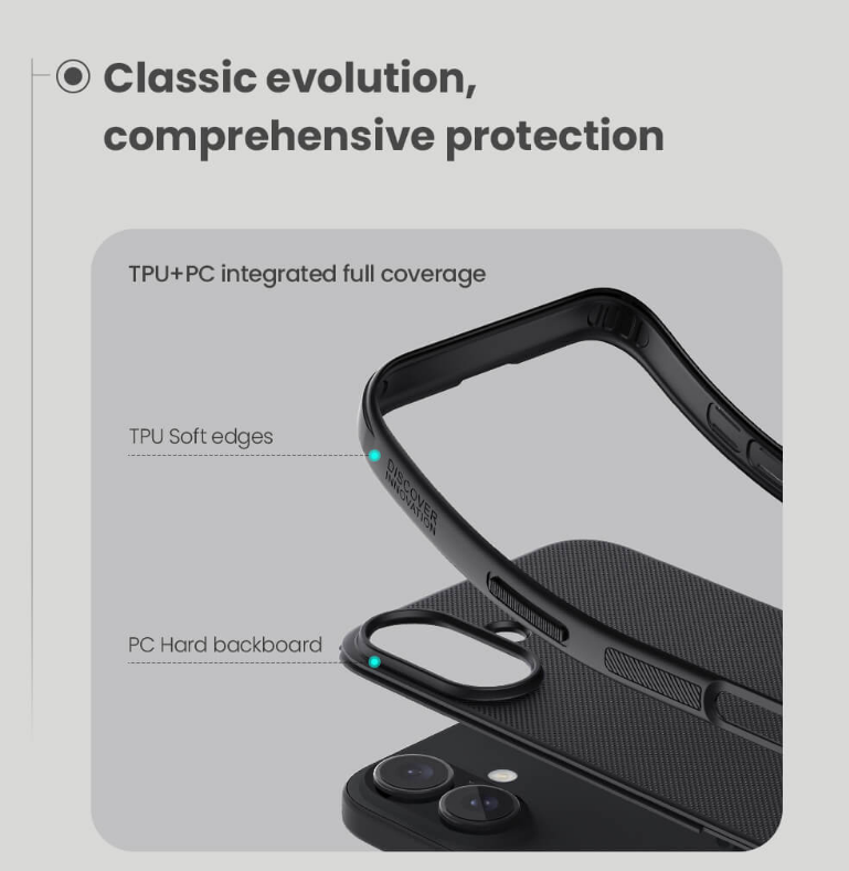 Η θήκη Super Frosted Pro της Nillkin είναι κατασκευασμένη για να εφαρμόζει τέλεια στο iPhone 16 Plus και να το προστατεύει από την καθημερινή χρήση χωρίς να προσθέτει όγκο στη συσκευή σας. Κατασκευασμένη από διπλή προστασία, σκληρού πολυανθρακικού PC και ανθεκτικού TPU, ώστε να προστατεύει από γρατζουνιές, φθορές ή χτυπήματα.
