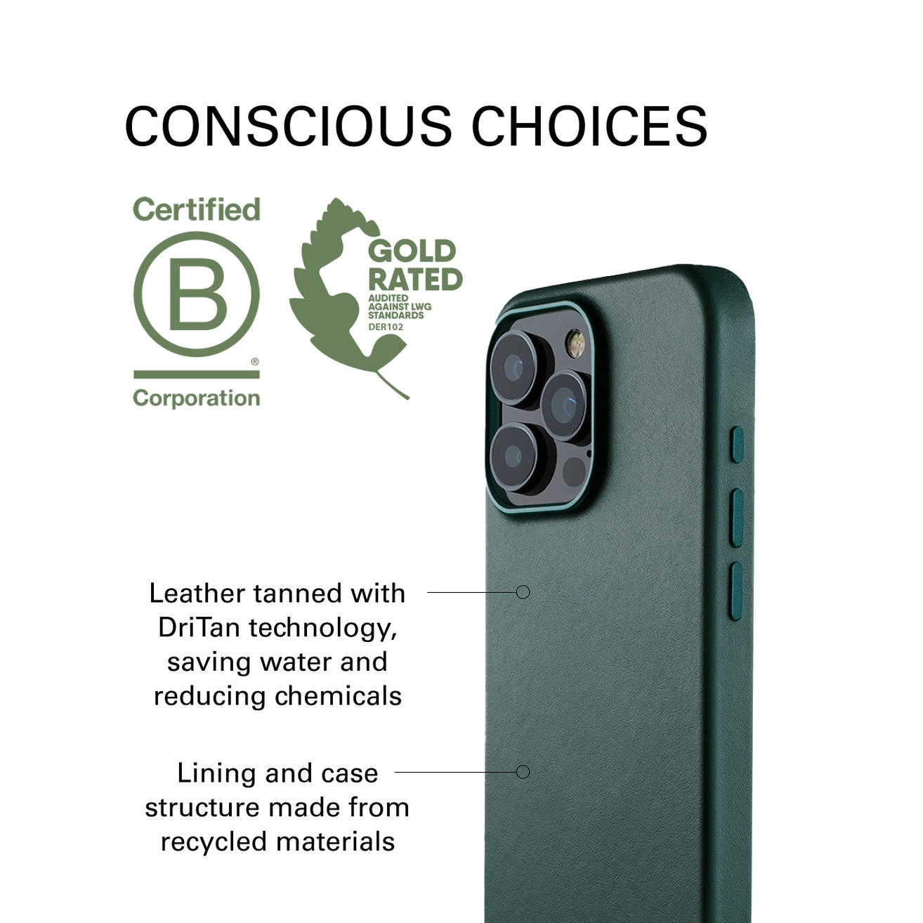 Είναι κατασκευασμένη από τα χαρακτηριστικής ποιότητας δεψασμένα δέρματα της MUJJO, τα οποία προμηθεύεται από την Ολλανδία, χρησιμοποιώντας τα «απόβλητα» από τη βιομηχανία ζώων, ενώ δεν χρησιμοποιεί σκληρά χημικά στη διαδικασία. Τα μη δερμάτινα υλικά της θήκης είναι όλα από ανακυκλωμένες πηγές και η συσκευασία δεν έχει πλαστικό, ενώ είναι βιοδιασπώμενη.