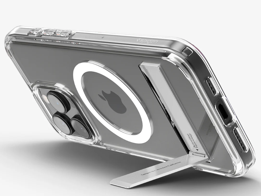 Στο πίσω μέρος ακόμα, διαθέτει ειδικό stand για να μπορείτε να τοποθετείτε το κινητό σας οριζόντια, ώστε να βλέπετε σειρές ταινίες ή ότι άλλο επιθυμείτε. Έχει αυξημένο χείλος περιμετρικά έτσι ώστε να προστατευτεί το κινητό σας σε μία πτώση με την μπροστινή όψη στο έδαφος. Διαθέτει μαγνητικό δακτύλιο, συμβατό με τον ασύρματο φορτιστή MagSafe, για γρήγορη και εύκολη φόρτιση.