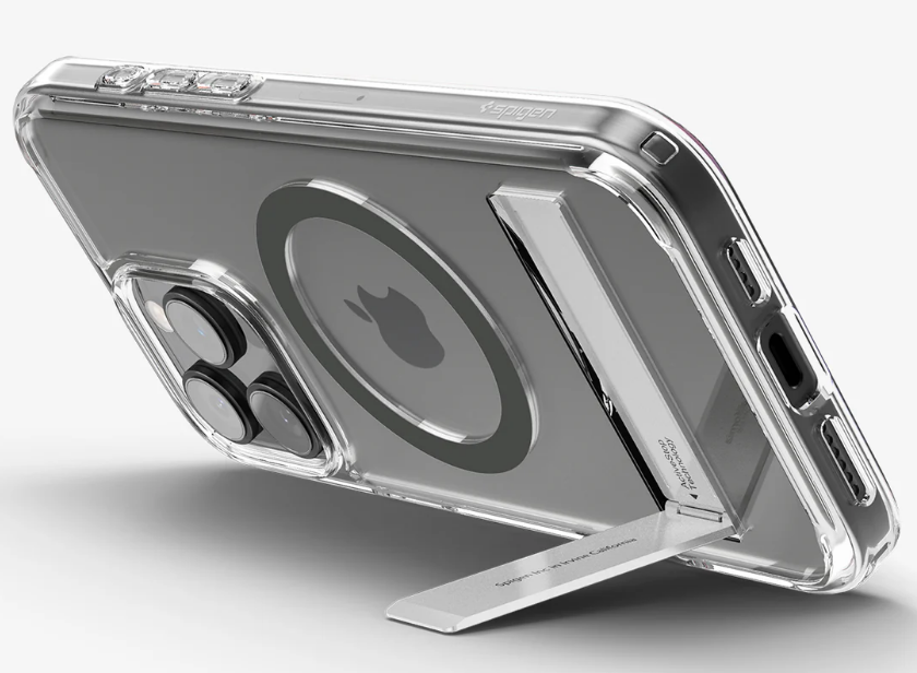 Στο πίσω μέρος ακόμα, διαθέτει ειδικό stand για να μπορείτε να τοποθετείτε το κινητό σας οριζόντια, ώστε να βλέπετε σειρές ταινίες ή ότι άλλο επιθυμείτε. Έχει αυξημένο χείλος περιμετρικά έτσι ώστε να προστατευτεί το κινητό σας σε μία πτώση με την μπροστινή όψη στο έδαφος. Διαθέτει μαγνητικό δακτύλιο, συμβατό με τον ασύρματο φορτιστή MagSafe, για γρήγορη και εύκολη φόρτιση.