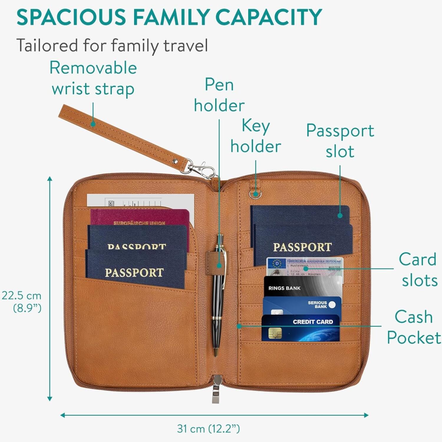 Είναι ειδικά σχεδιασμένο για οικογενειακά ταξίδια, καθώς το πορτοφόλι διαθέτει 6 υποδοχές για διαβατήρια, 4 θήκες για κάρτες, 2 τσέπες για εισιτήρια, επιπλέον χώρους για χρήματα και ταξιδιωτικά έγγραφα, 1 υποδοχή για στυλό και 1 υποδοχή για κλειδί. Επιπλέον, εξωτερικά είναι σχεδιασμένο με 2 τσέπες για εισιτήρια και ταξιδιωτικά έγγραφα και 1 τσέπη με φερμουάρ.