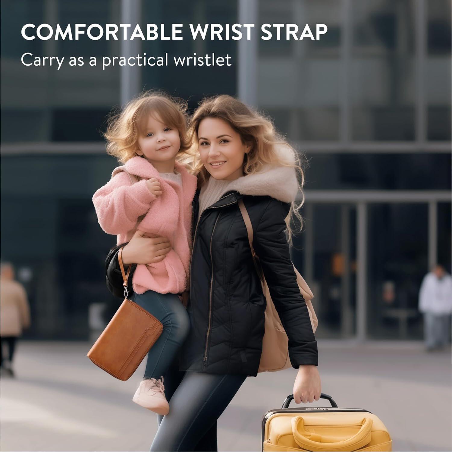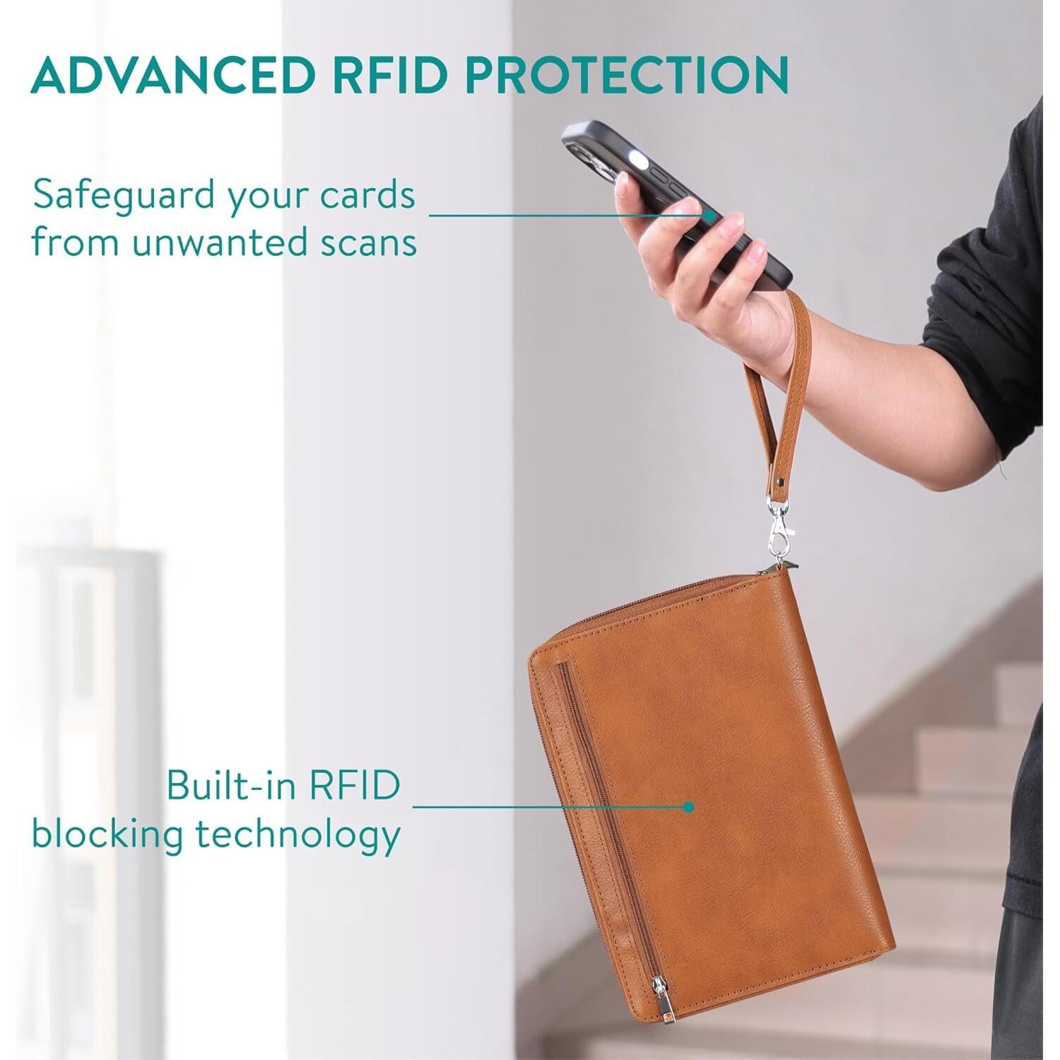 Προσφέρει μοναδική προστασία με την προηγμένη τεχνολογία RFID, προστατεύοντας τις πληροφορίες σας από ανεπιθύμητες σαρώσεις, ενώ διατηρεί τα πάντα οργανωμένα και εύκολα προσβάσιμα. Το αποσπώμενο λουράκι χειρός προσφέρει άνεση στη μεταφορά, καθιστώντας τη θήκη ως κομψό πορτοφόλι καρπού, ιδανικό ακόμα και για τις γρήγορες εξορμήσεις σας.