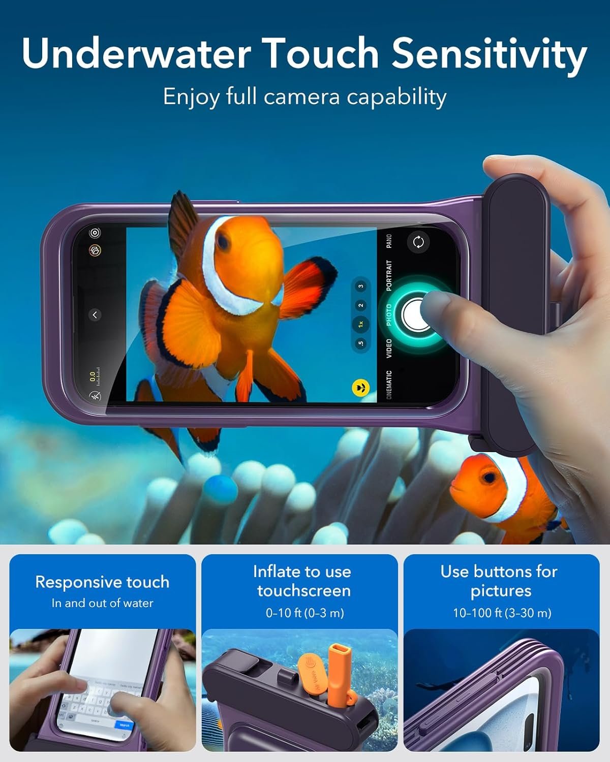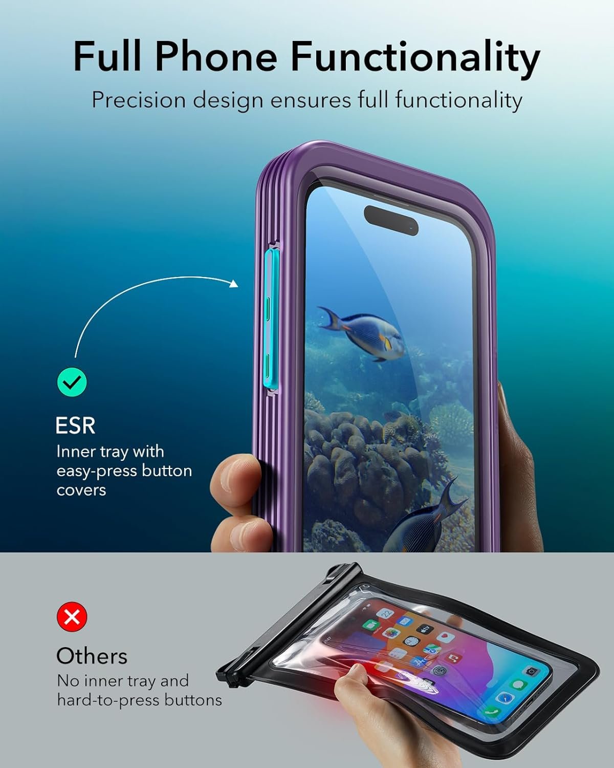 Ο σχεδιασμός της εξασφαλίζει την πλήρη λειτουργικότητα του τηλεφώνου σας, επιτρέποντάς σας να χρησιμοποιείτε την οθόνη αφής και τα κουμπιά ακόμα και υποβρύχια. Μπορείτε να τραβάτε καθαρές φωτογραφίες και βίντεο κάτω από το νερό, ενώ η θήκη παραμένει απόλυτα σφραγισμένη, διατηρώντας την αρχική ποιότητα της κάμερας.
