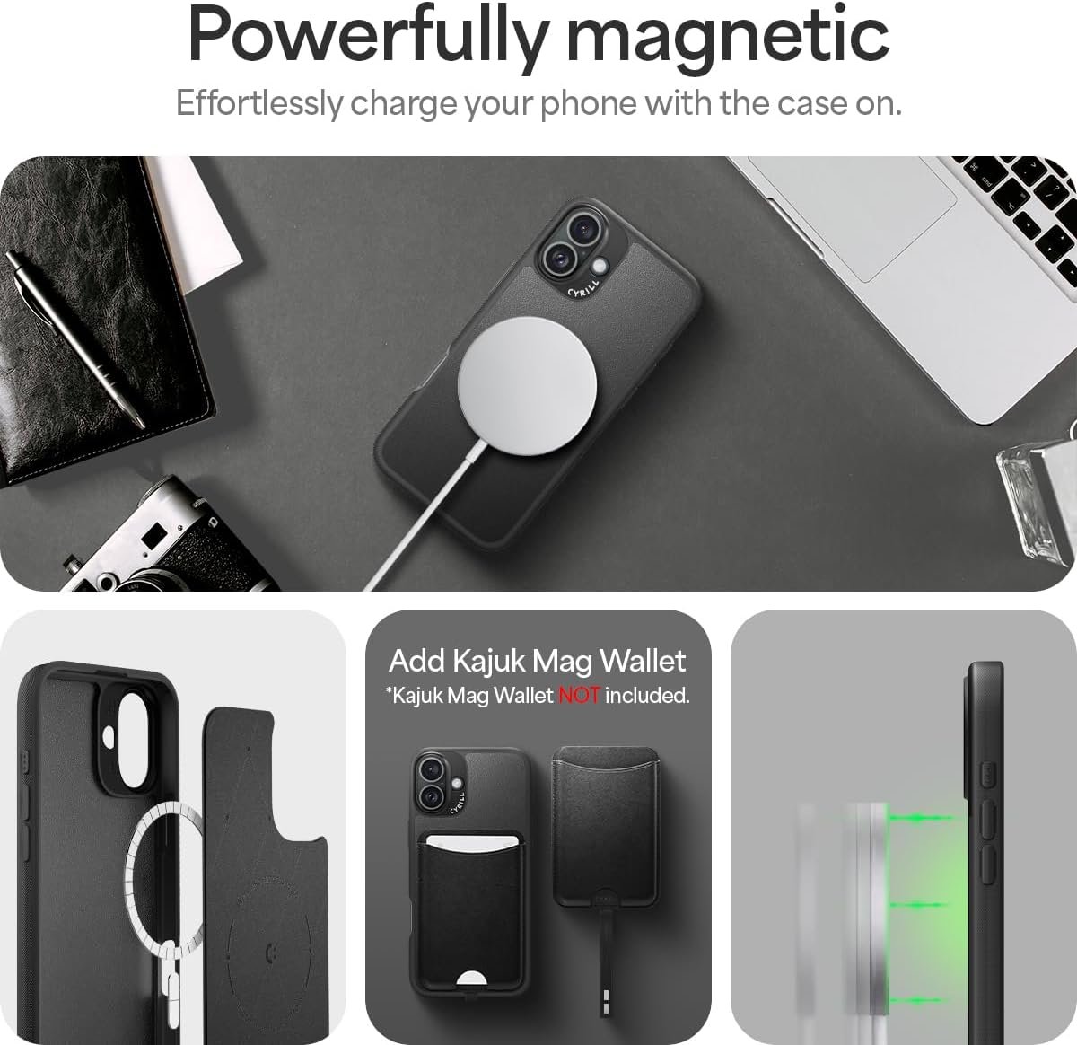 Επιπλέον, διαθέτει ενσωματωμένο μαγνήτη για τον φορτιστή MagSafe, για γρήγορη και εύκολη φόρτιση, με μοναδική σχεδίαση που κάνει το φορτιστή MagSafe να προσαρμόζεται στη θήκη Cyrill Kajuk Mag και στο τηλέφωνο με τέλειο τρόπο. Επίσης, έχει εγκοπές για ένα λουράκι χειρός (δεν περιλαμβάνεται).