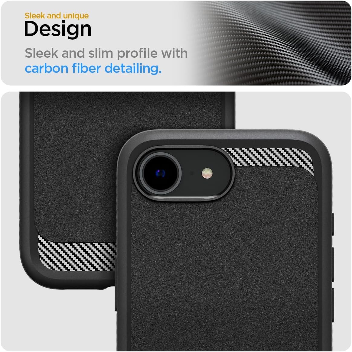 Είναι κατασκευασμένη από θερμοπλαστική πολυουρεθάνη (TPU), η οποία απορροφά τους κραδασμούς με τη βοήθεια της τεχνολογίας Air Cushion, είναι ελαστική με φινίρισμα από ανθρακονήματα, εσωτερικά κυψελοειδής και εύκαμπτη προστατεύοντας το iPhone 16e από γρατζουνιές, φθορές, πτώσεις ή χτυπήματα.