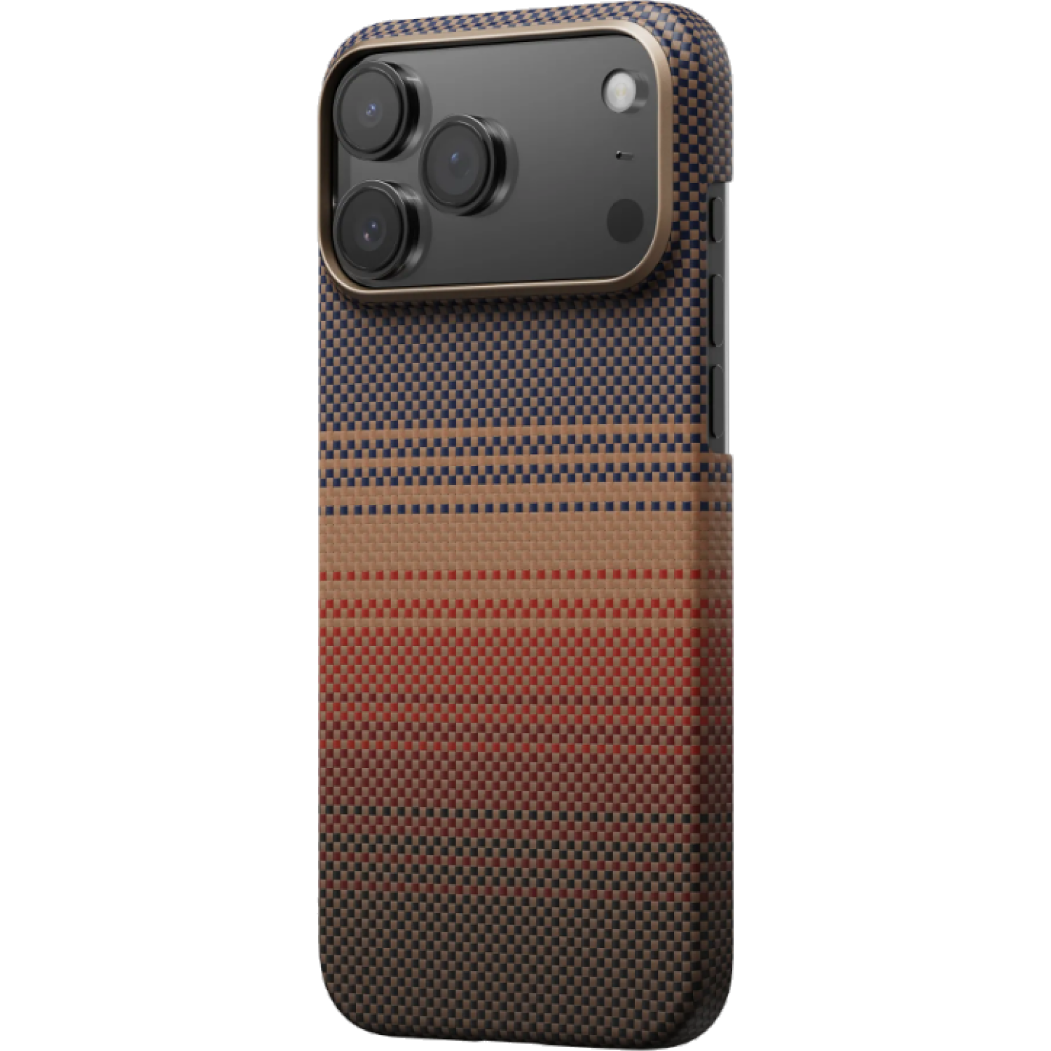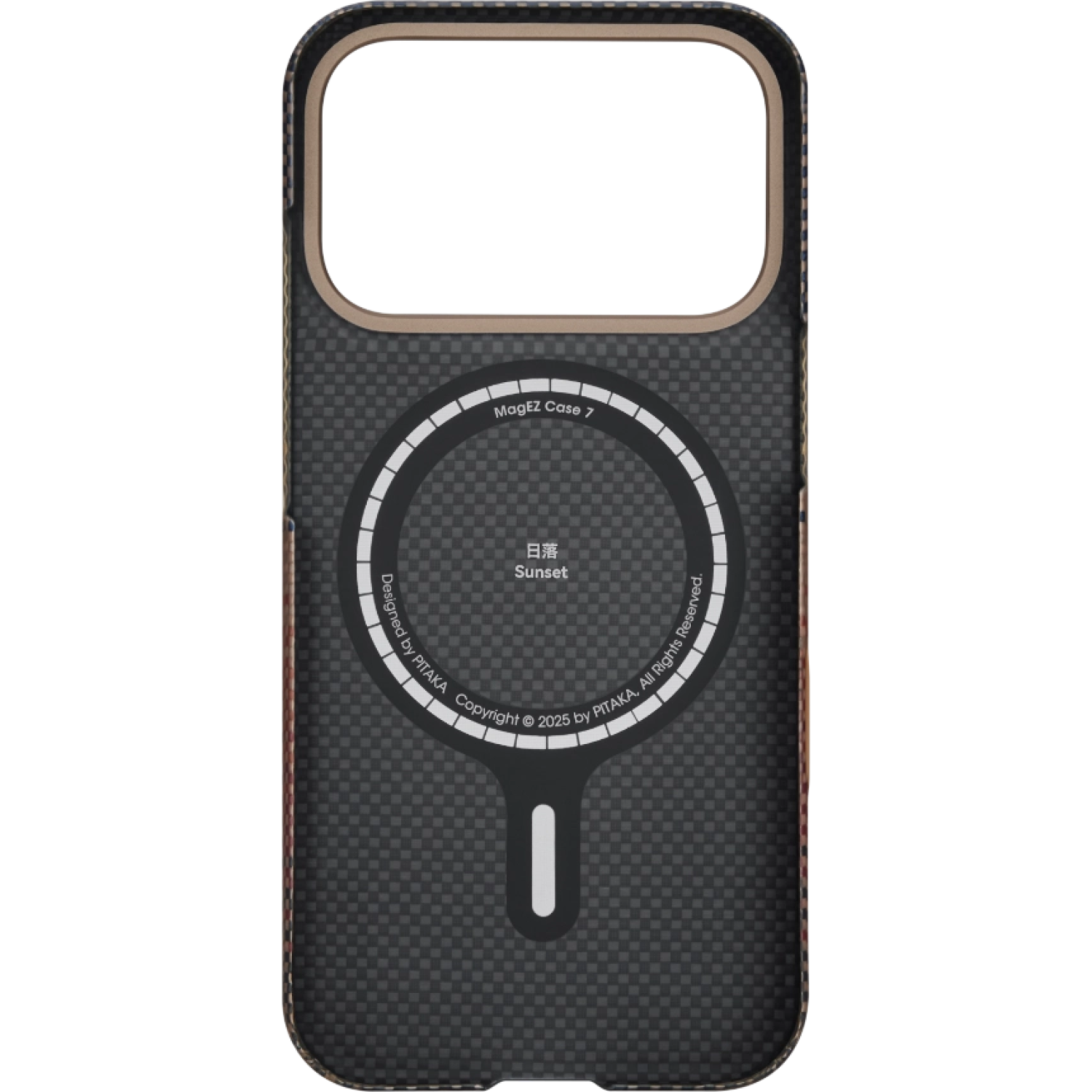 Δημιουργήθηκε με έμπνευση την δύση του ήλιου, όταν το ηλιοβασίλεμα έχει σχεδόν ξεθωριάσει και η ανατολή του φεγγαριού πλησιάζει, o ουρανός εμφανίζει χρώματα που μεταβαίνουν στο ζεστό, ώστε να αποτυπωθούν εκπληκτικά στην θήκη Sunset! Είναι κατασκευασμένη από ανθεκτικές ίνες αραμιδίου, χρησιμοποιώντας την τεχνική Weaving+, έτσι επιτρέπει την ύφανση των έγχρωμων ινών με χρήση πολλαπλών τεχνικών ύφανσης σε έναν μόνο αργαλειό, παράγοντας έτσι πολύμορφες, πολύχρωμες θήκες από ίνες αραμιδίου.