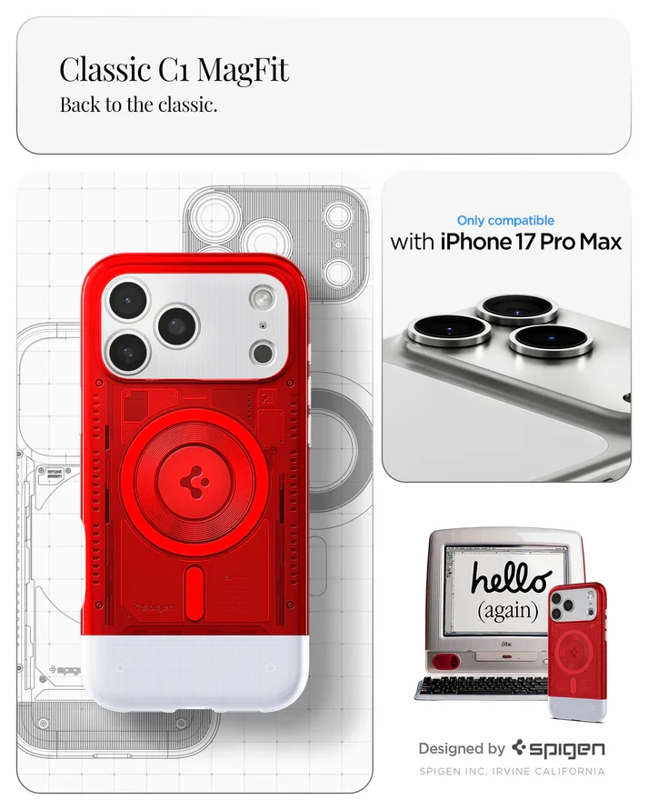 Επιστρέψτε στο παρελθόν με την μοναδική retro θήκη Classic C1, της Spigen, η οποία θα χαρίσει στο αγαπημένο σας iPhone 17 Pro Max, την κλασική και εμβληματική εμφάνιση του iMac G3! Σχεδιασμένη με ημιδιαφανή, φωτεινά χρώματα, αυτή η νέα καινοτομία της Spigen αποτελεί το απόλυτο παράδειγμα του σχεδιασμού του 1998 και αντανακλά μία νοσταλγία για την περίοδο της αλλαγής του αιώνα!