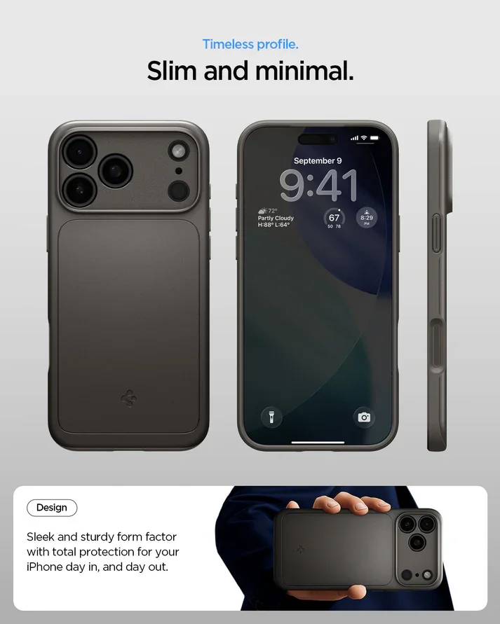 Η MagSafe θήκη Thin Fit MagFit της Spigen είναι κατασκευασμένη για να εφαρμόζει τέλεια στο iPhone 17 Pro Max και να το προστατεύει από την καθημερινή χρήση χωρίς να προσθέσει όγκο στη συσκευή σας! Επιπλέον, η ανυψωμένη στεφάνη στην οθόνη και στην κάμερα είναι σχεδιασμένη για πρόσθετη προστασία, ενώ απορροφά τους κραδασμούς με τη βοήθεια της τεχνολογίας Air Cushion.
