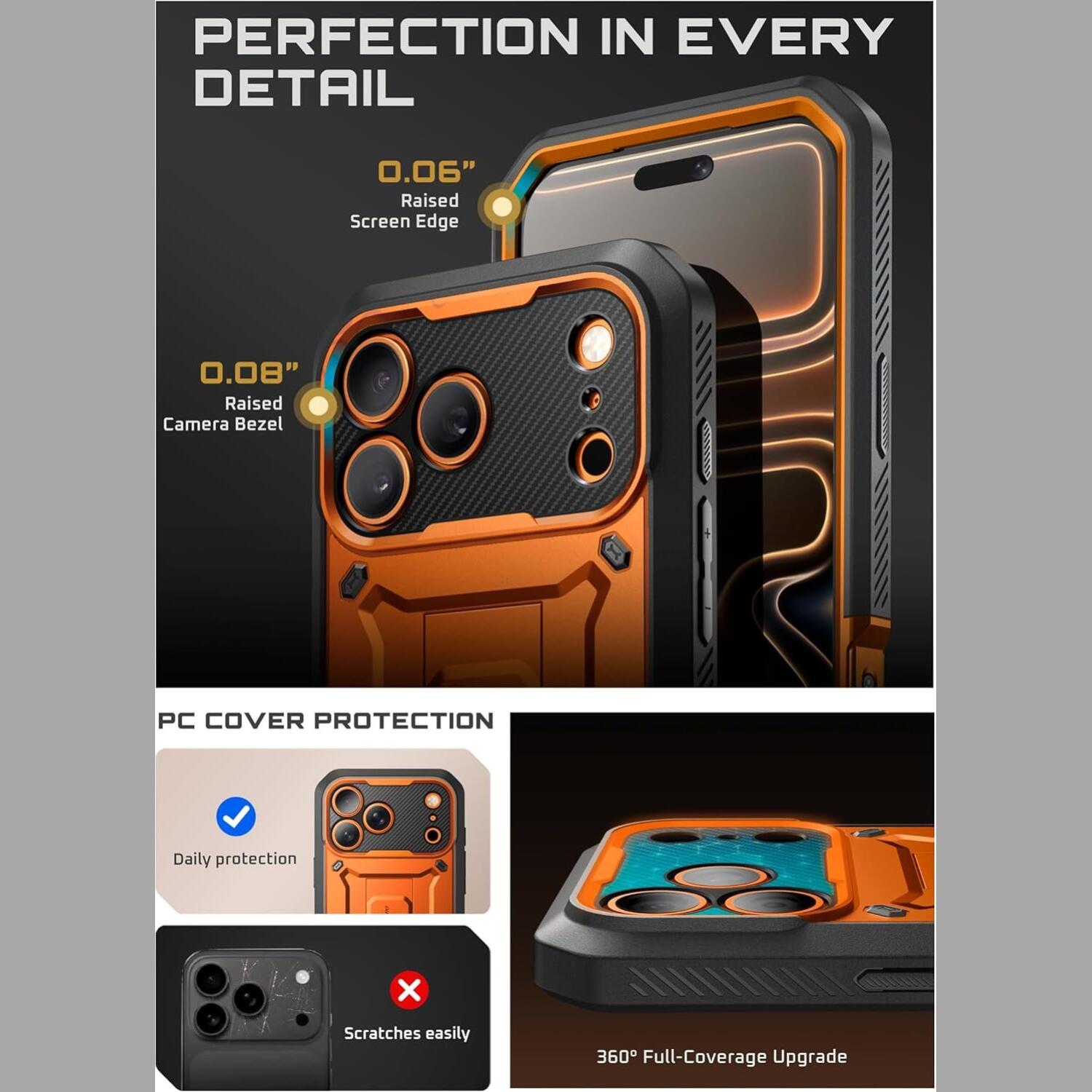 Στο μπροστινό μέρος, έχει κατασκευαστεί με ανυψωμένες στεφάνες, προσφέροντας έτσι επιπλέον προστασία της οθόνης σας από πτώσεις στο έδαφος. Ένα επιπλέον πλεονέκτημα αυτής της θήκης στο εξωτερικό της κομμάτι, είναι ότι περιλαμβάνεται περιστρεφόμενο κομμάτι (360ᵒ), το οποίο "κουμπώνει" πάνω στην αρχική θήκη και σας δίνει τη δυνατότητα να την περάσετε στη ζώνη του παντελονιού σας και να το προσαρμόσετε όπως εσείς επιθυμείτε.