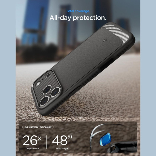 Είναι κατασκευασμένη από θερμοπλαστική πολυουρεθάνη TPU, PC και Impact Foam, έτσι, απορροφά τους κραδασμούς με τη βοήθεια της τεχνολογίας Air Cushion. Είναι ελαστική με φινίρισμα από ανθρακονήματα, εσωτερικά κυψελοειδής και εύκαμπτη προστατεύοντας το iPhone 17 Pro από γρατζουνιές, φθορές, πτώσεις ή χτυπήματα.
