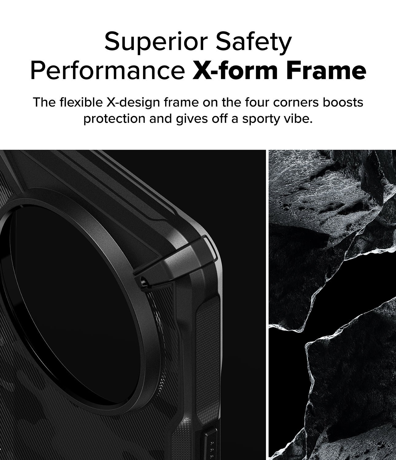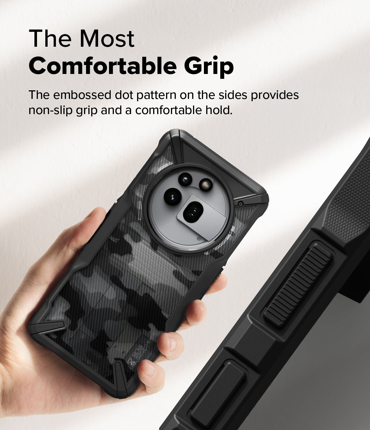 Αγκαλιάζει περιμετρικά τη συσκευή ώστε να απορροφά πλήρως τους κραδασμούς και διαθέτει ένα υπερυψωμένο χείλος περιμετρικά για να προστατεύσει την οθόνη σας από μία ενδεχόμενη πτώση στο έδαφος.