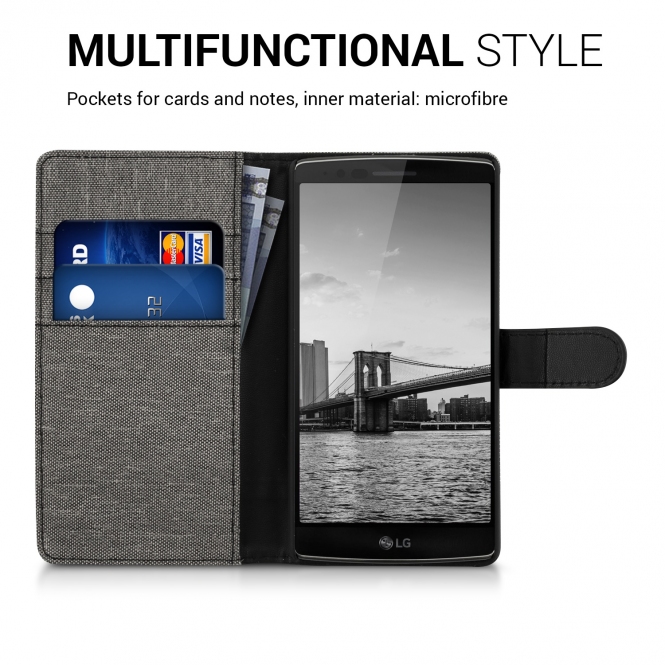 Το πορτοφόλι - θήκη είναι ειδικά σχεδιασμένο για το LG G Flex 2, και διαθέτει 2 θήκες για πιστωτικές κάρτες και μια εσωτερική θήκη για χαρτονομίσματα. Με μαγνητικό κλιπ για ευκολότερη χρήση.