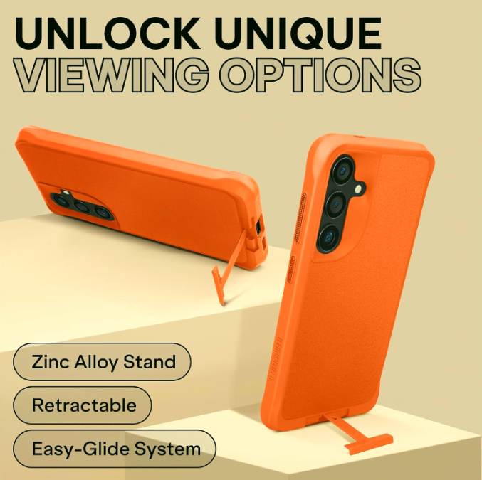 Η μοναδική ενσωματωμένη βάση kickstand από κράμα ψευδάργυρου επιτρέπει την οριζόντια και κάθετη προβολή, καθιστώντας την ιδανική για παρακολούθηση βίντεο, βιντεοκλήσεις ή gaming, ενώ όταν δεν χρησιμοποιείται, αναδιπλώνεται διακριτικά στο πίσω μέρος της θήκης.