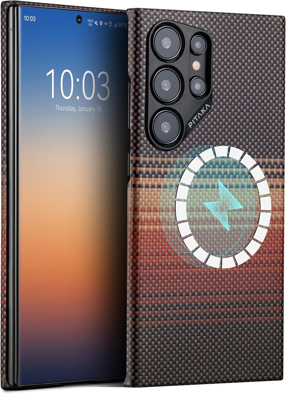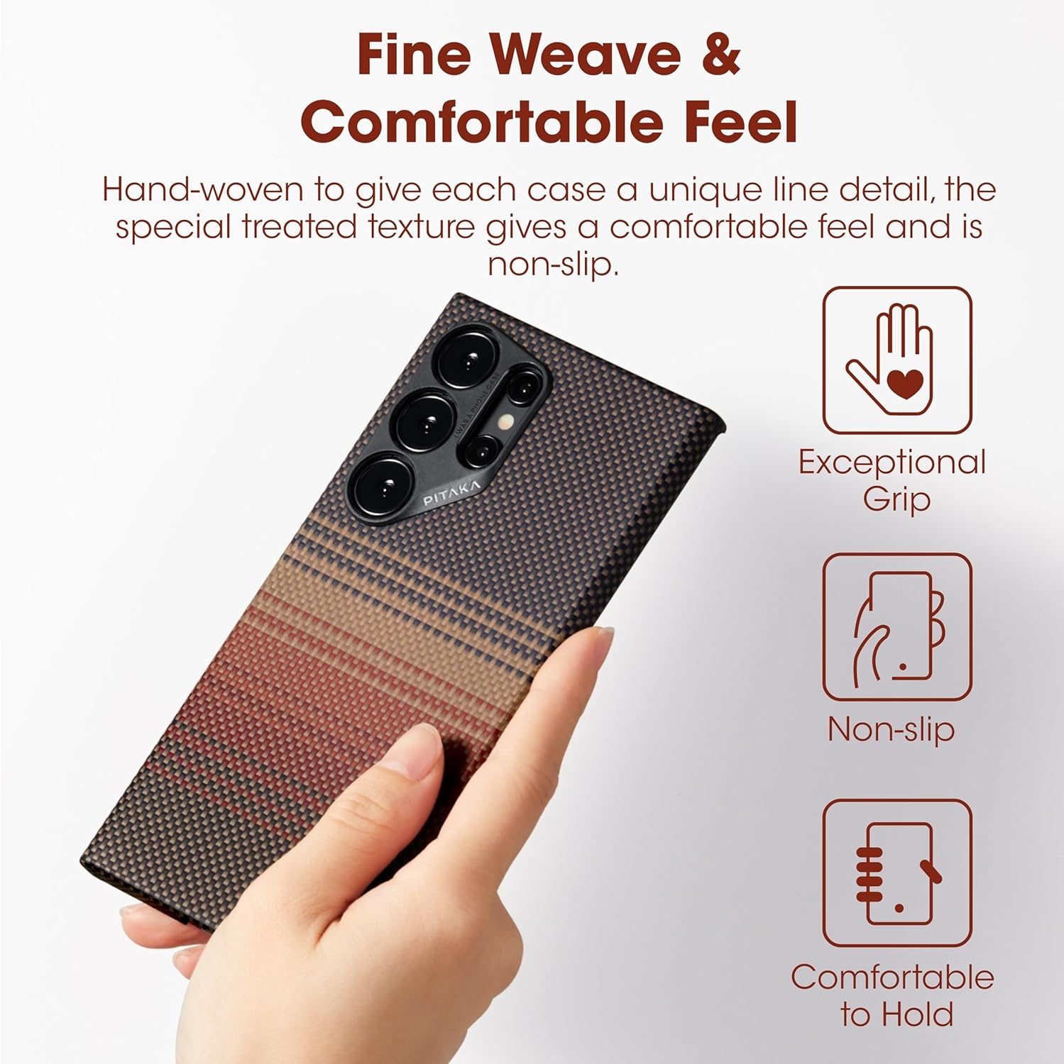 Η θήκη Fusion Weaving MagEZ Case 4 της Pitaka είναι η πιο λεπτή και ελαφριά θήκη που έχει σχεδιαστεί για το αγαπημένο σας Samsung Galaxy S24 Ultra και αποπνέει διαχρονική πολυτέλεια. Είναι συμβατή με τον φορτιστή και τα αξεσουάρ MagSafe, ενώ είναι τόσο λεπτή όσο μια πιστωτική κάρτα! Είναι κατασκευασμένη από ανθεκτικές ίνες αραμιδίου, χρησιμοποιώντας την τεχνική Fusion Weaving, έτσι επιτρέπει την ύφανση των έγχρωμων ινών με χρήση πολλαπλών τεχνικών ύφανσης σε έναν μόνο αργαλειό, παράγοντας έτσι πολύμορφες, πολύχρωμες θήκες από ίνες αραμιδίου.
