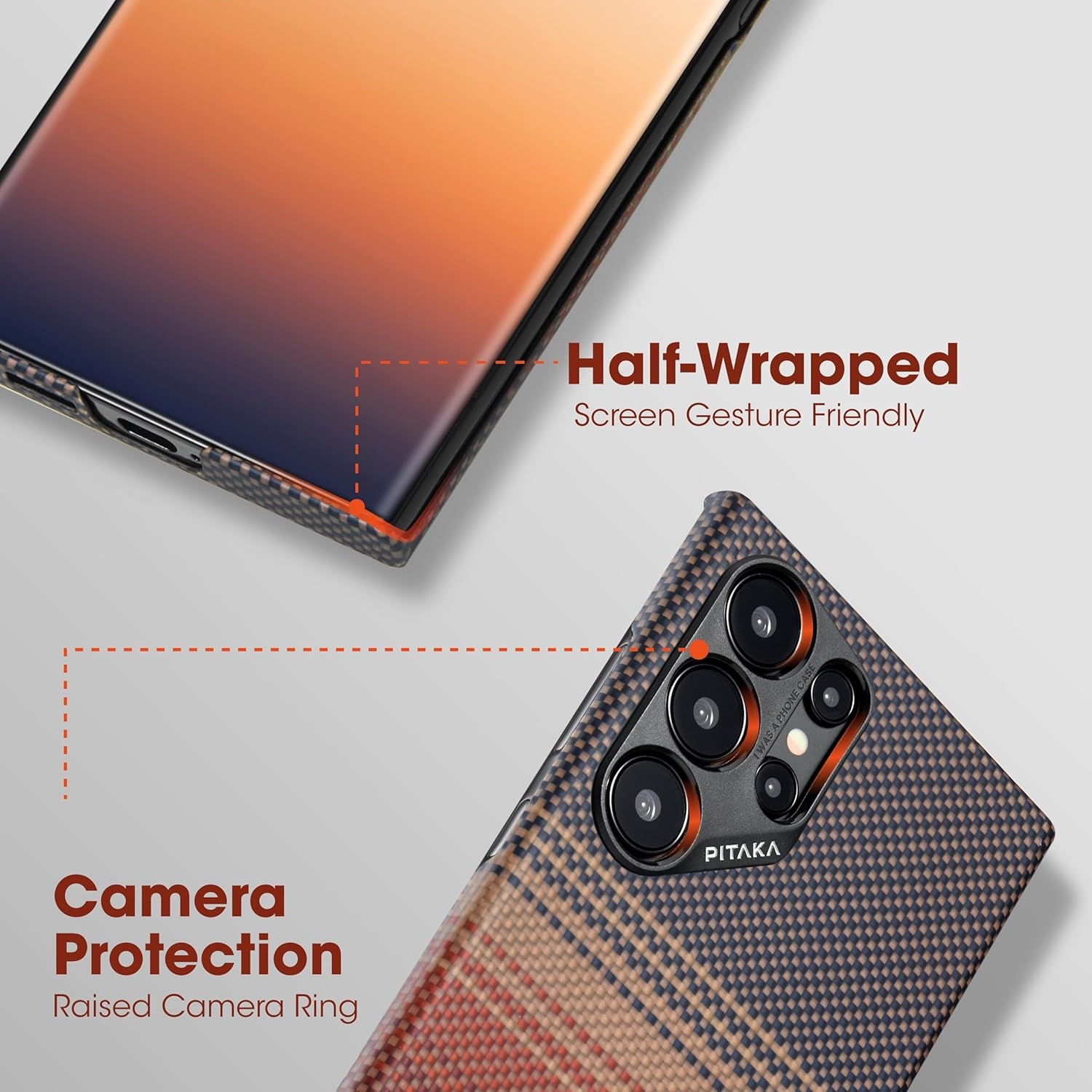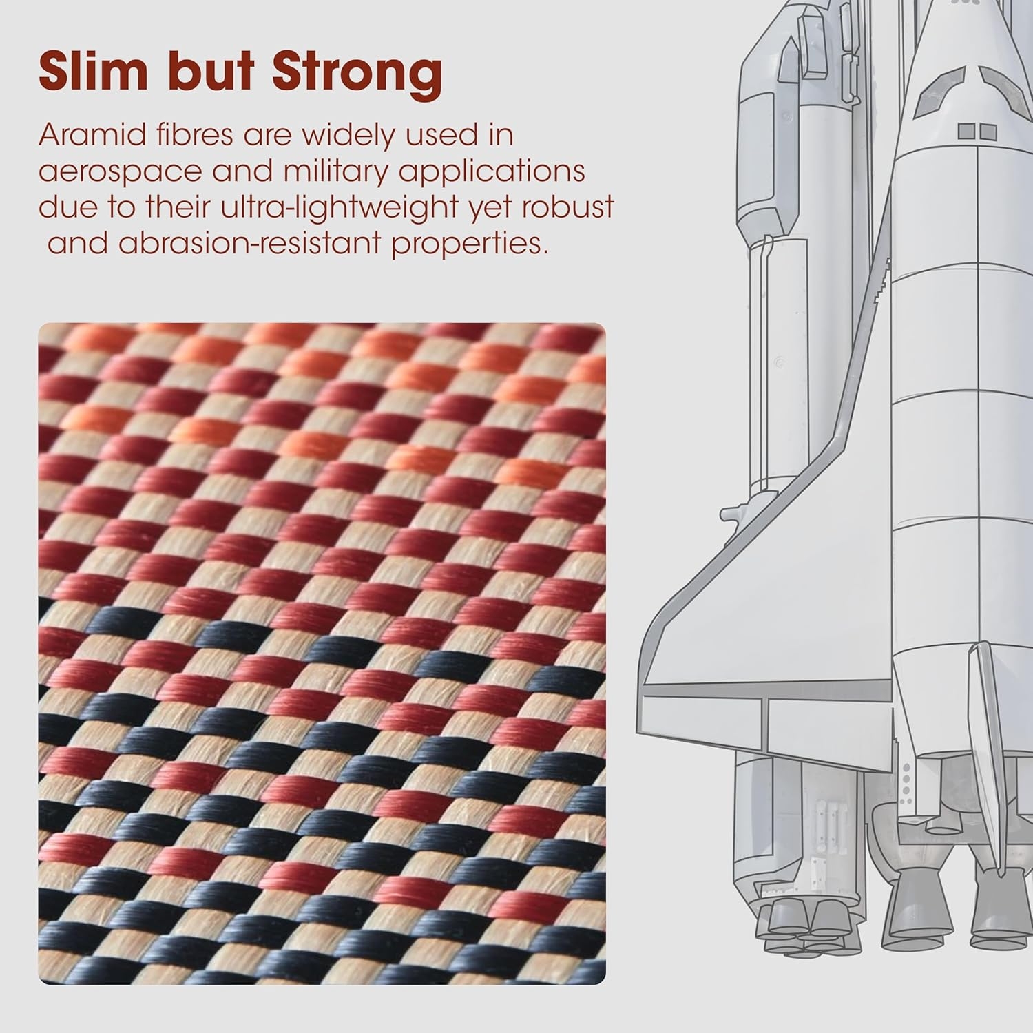 Η θήκη είναι κατασκευασμένη με χρήση ινών αραμιδίου αεροδιαστημικής ποιότητας, η οποία είναι 5 φορές ισχυρότερη από το ατσάλι αλλά είναι περίπου 5 φορές ελαφρύτερη. Προσφέρει μινιμαλιστικό στυλ, ώστε να απολαύσετε τον αυθεντικό σχεδιασμό του Samsung Galaxy S24 Ultra και να εκτιμήσετε την ομορφιά του όσο το δυνατόν περισσότερο. Η κοπή λοξοτομής κάνει τη θήκη να φαίνεται πιο λεπτή και πιο άνετη στο κράτημα.