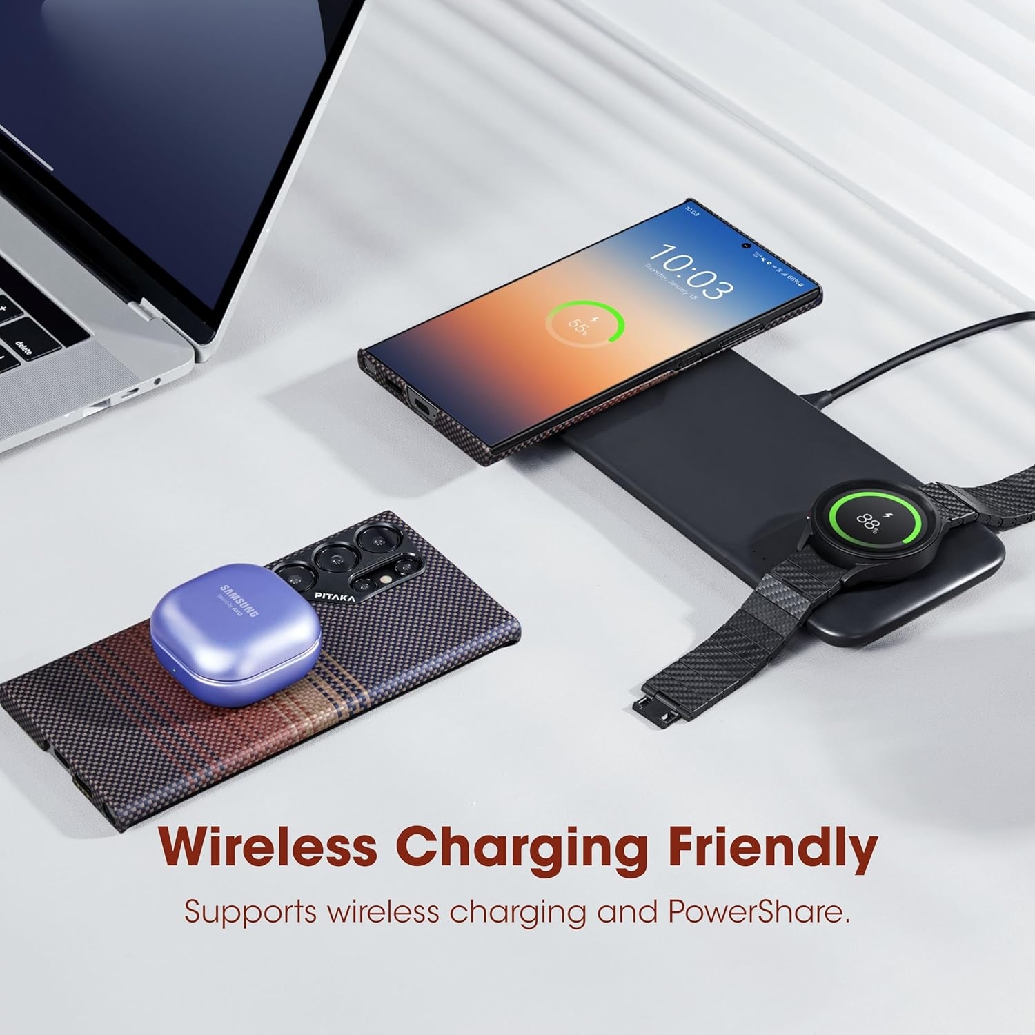 Συμβατό με αξεσουάρ PITAKA MagEZ 2.0, συμπεριλαμβανομένων των το MagEZ Slider 2, το MagEZ Car Mount Pro 2 και το MagEZ Grip. Συμβατή με ασύρματους φορτιστές Samsung, συμπεριλαμβανομένων EP-P6300, EP-H5300, EP-P2400, EP-NG930, EP-P5400, EP-P1300, EP-N5200, EP-P5200, EP-P1100, EP-P01, EP-N60 , EP-PG950, κ.λπ.