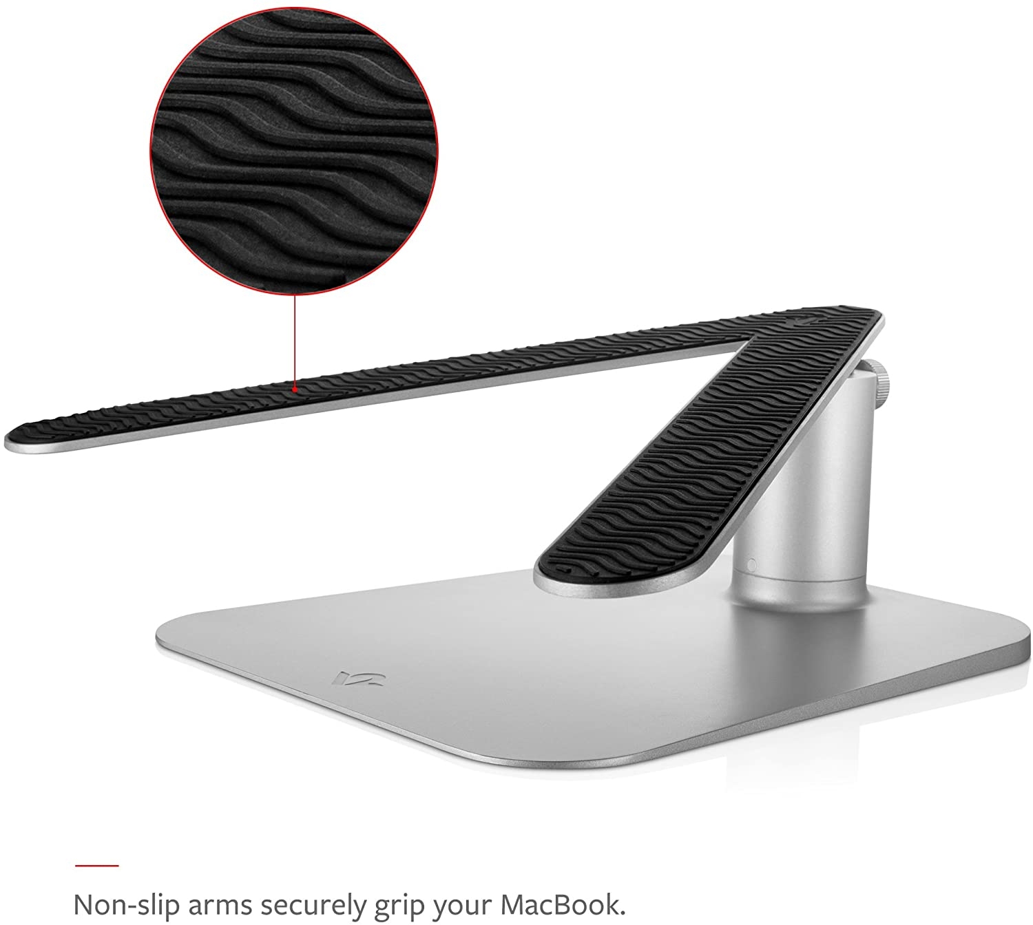Το HiRise έχει βραχίονες σε σχήμα V που είναι επενδεδυμένοι με μαλακή σιλικόνη, ώστε να κρατούν το αγαπημένο σας laptop ή tablet σταθερό. Στο κάτω μέρος της μεταλλικής βάσης, θα βρείτε ράγες από τεφλόν που σας επιτρέπουν να περιστρέφετε το HiRise από τη μία πλευρά στην άλλη χωρίς να αφήνετε σημάδια στην επιφάνεια του γραφείου σας.