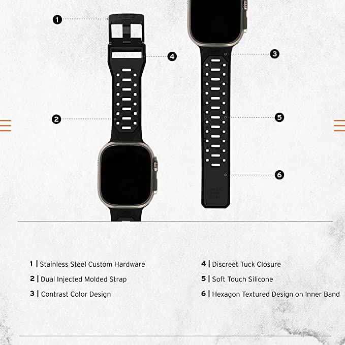 Το λουράκι σιλικόνης της UAG, διαθέτει κυψελοειδής σχεδίαση με αντίθεση hypercussh, είναι εξοπλισμένο με ανθεκτικό κούμπωμα από ανοξείδωτο ατσάλι για την ρύθμιση που επιθυμείτε, με αποτέλεσμα το λουράκι σας να παραμένει με ασφάλεια στον καρπό σας όλες τις ώρες.